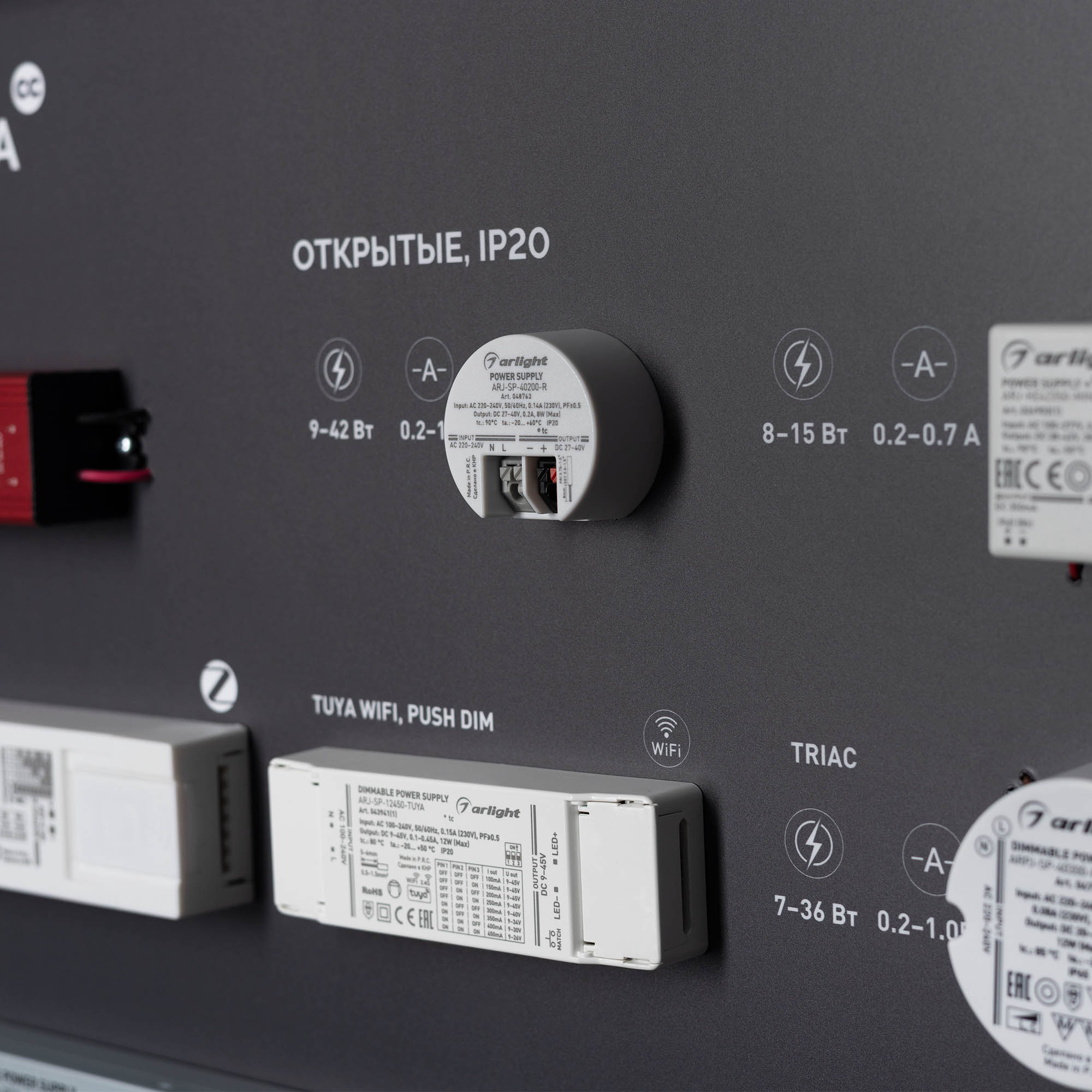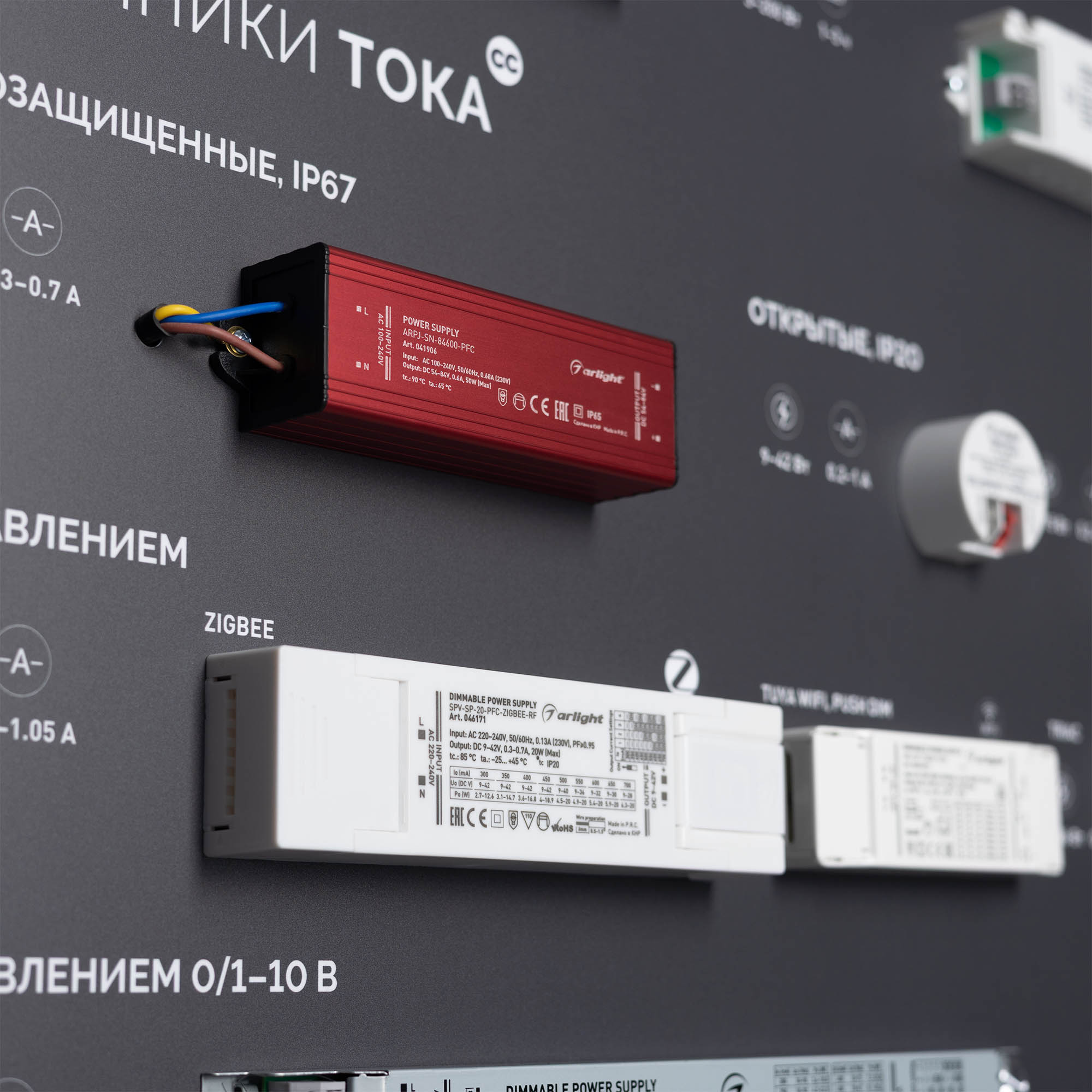 Представлены герметичные (IP65/IP67) и негерметичные (IP20), диммируемые (TRIAC, 0/1-10V, DALI) и специализированные с управлением TUYA WiFi, Zigbee, NFC, а также модели с дип-регулировкой и датчиком освещения.