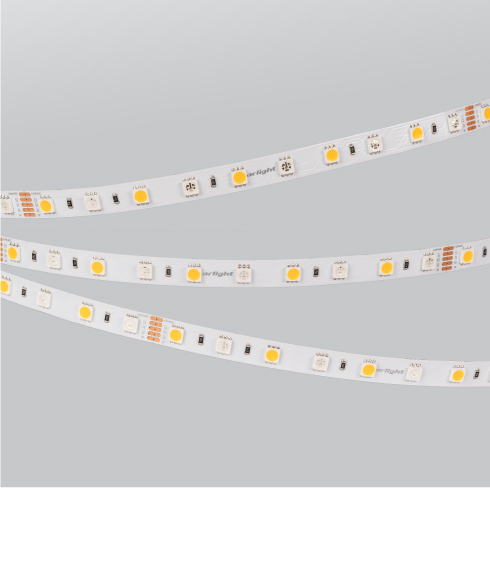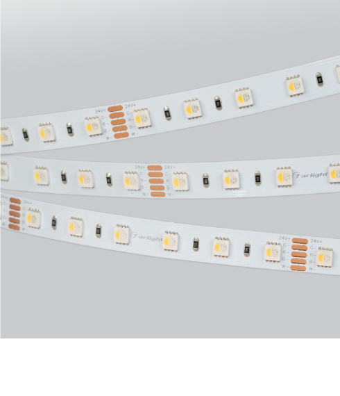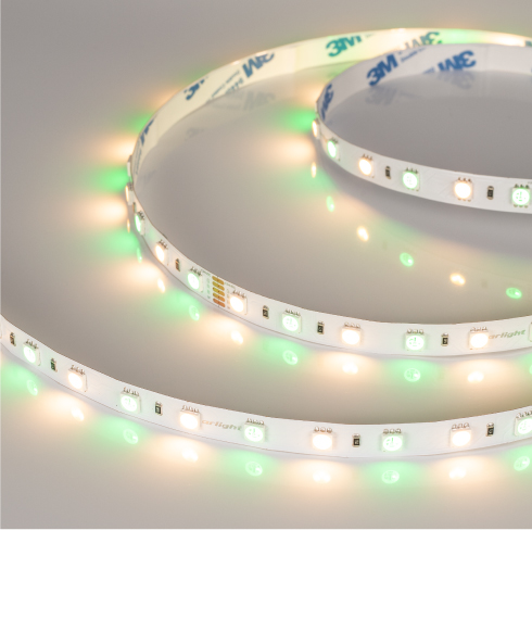Ленты с управлением цветом и тоном, серия B60. Тип светодиодов 5060 (B), 60 светодиодов на 1 метр. Герметизация IP65, тип покрытия SE - герметик закрывает верхний слой платы. Лента 4-в-1 со смешением цветов и белого тона. Декоративная мультицветная подсветка ниш, элементов интерьера.