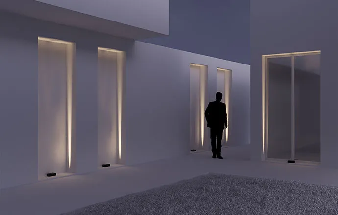Накладной светильник с узколучевой линзовой оптикой для подсветки оконных проемов. Светильник предназначен для создания декоративных световых эффектов как внутри, так и снаружи зданий.