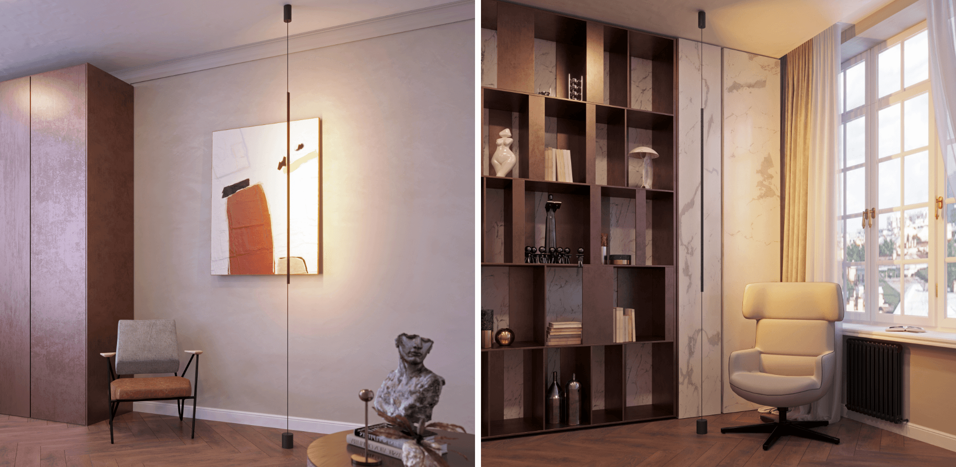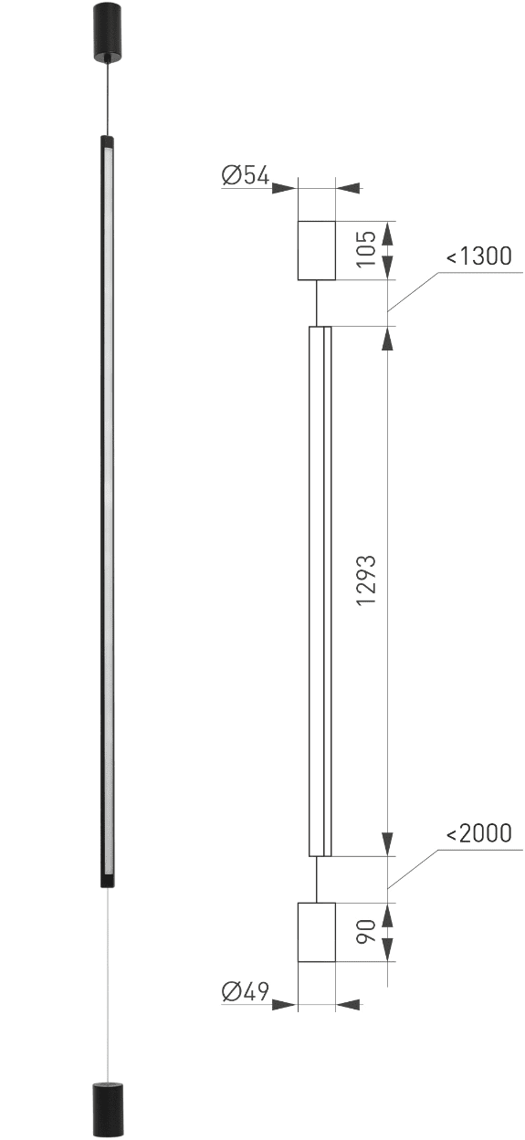 Длина светового модуля составляет 1293 мм. Линейный светильник с креплением от потолка до пола может зонировать пространство и стать стильным декоративным элементом.