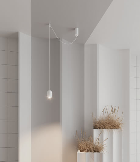 Белый или черный корпус из металла. Держатель крепится к потолку и позволяет фиксировать трос светильника с любым изгибом на нужной высоте.