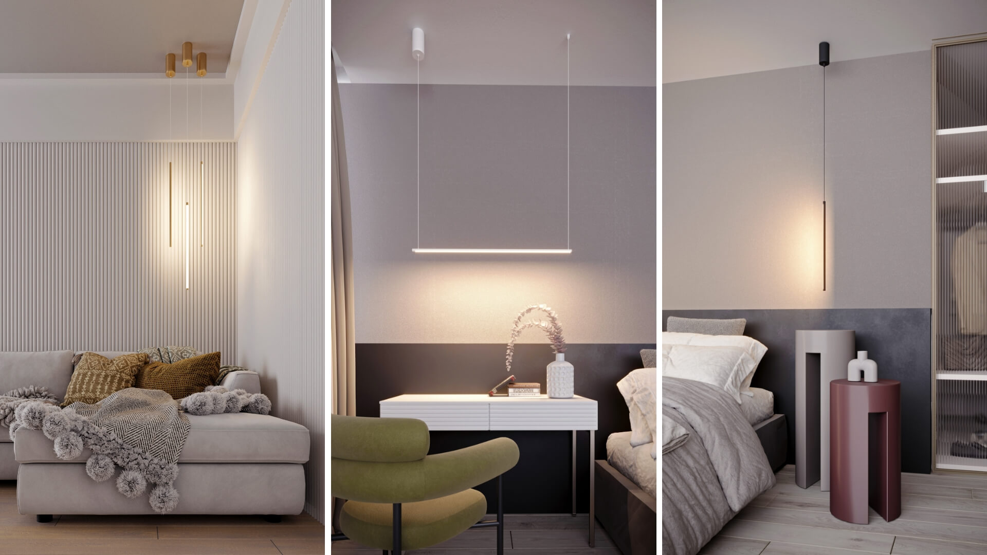 Композиции из нескольких светильников будут стильно смотреться при оформлении гостиных и спальных зон.