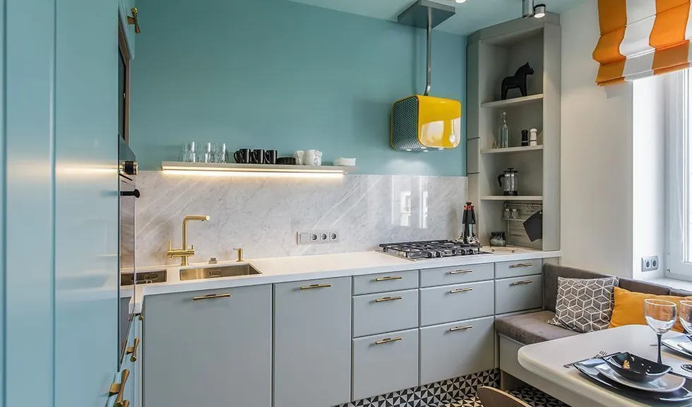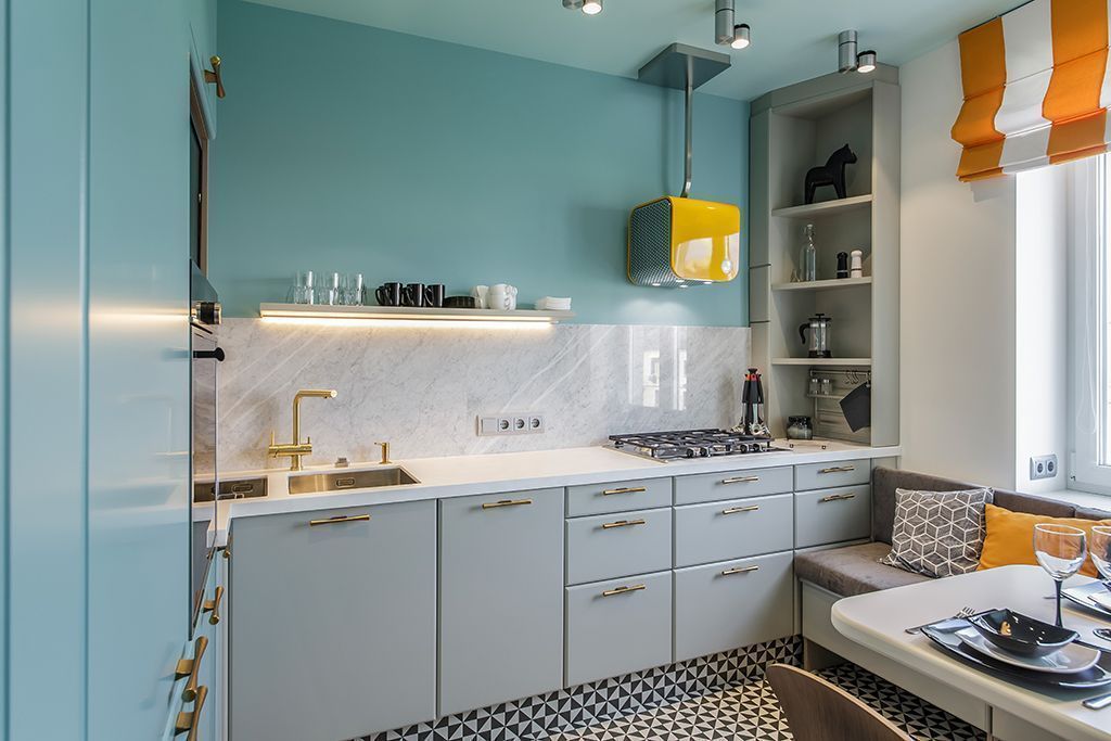 При создании проекта кухни одна из задач, поставленных перед дизайнерами, была сократить количество навесных шкафов над рабочей поверхностью, чтобы сделать помещение более открытым и просторным. Таким образом, кухня получилась легкой, а рабочая зона – открытой.