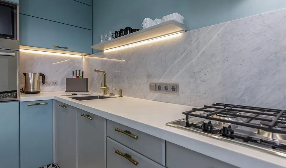 Используемый профиль MIC-2000 ANOD – самый плоский накладной профиль с экраном. Его высота всего 6 мм, что делает его максимально незаметным при установке и эксплуатации. Использование матового экрана создает освещение, комфортное при приготовлении блюд.