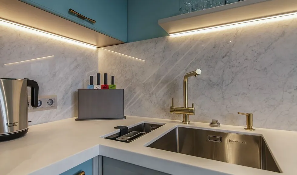 При подсветке рабочей зоны необходимо было создать яркое и, одновременно, мягкое освещение. Кроме того, минимальное количество шкафов и полок над рабочей поверхностью требовали максимально незаметных светильников.