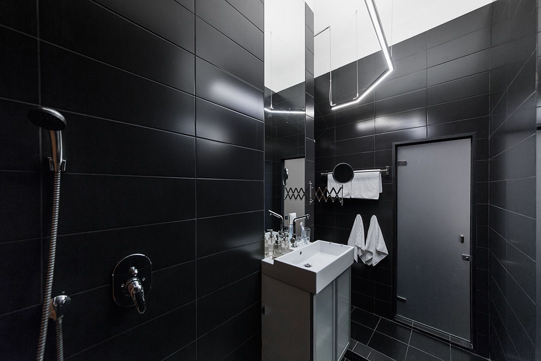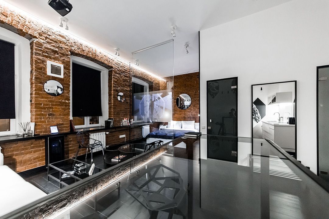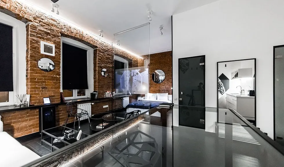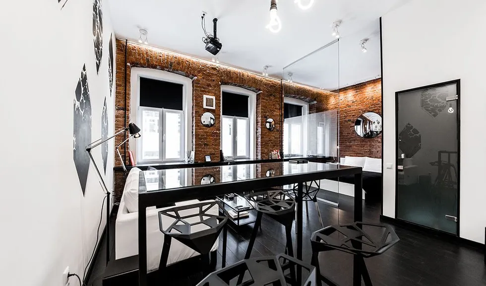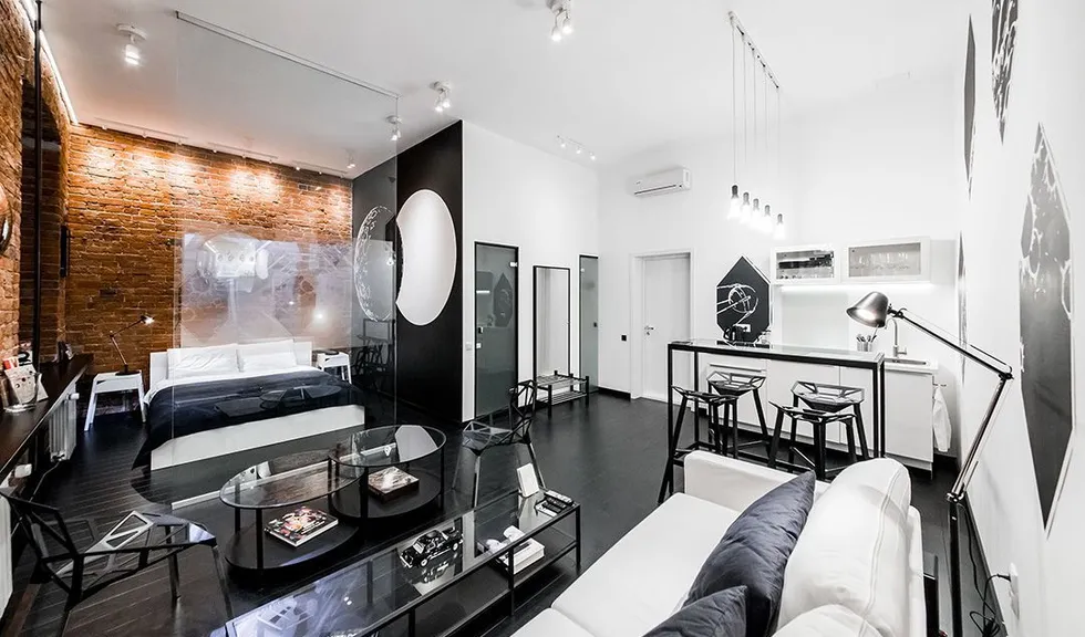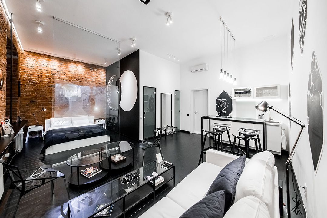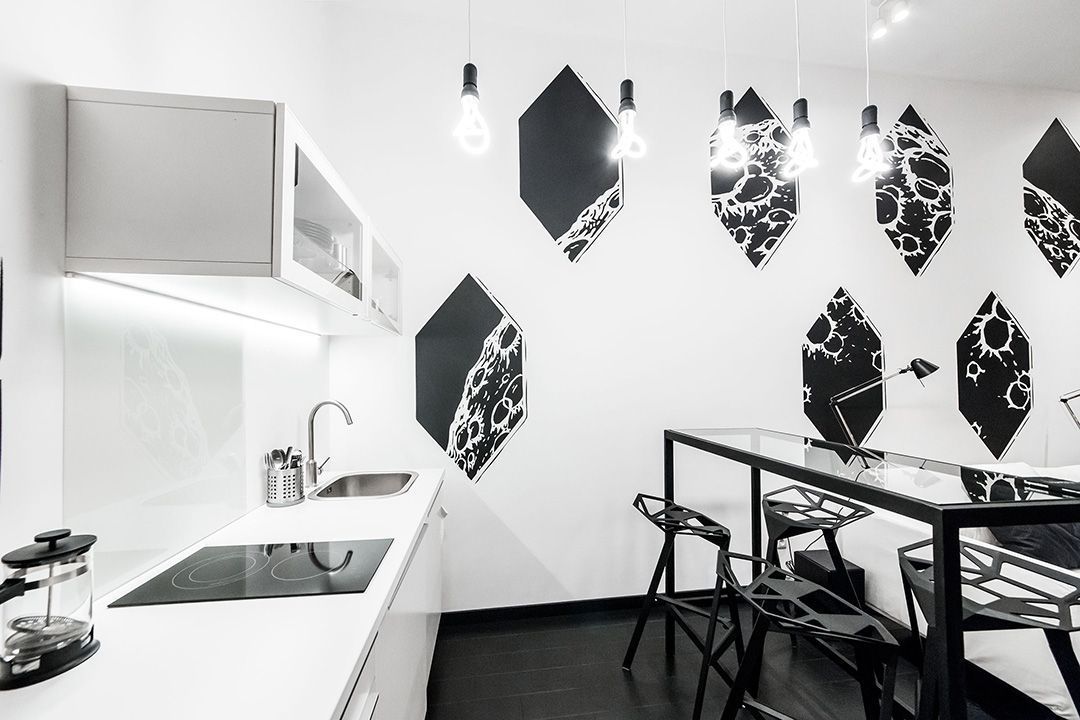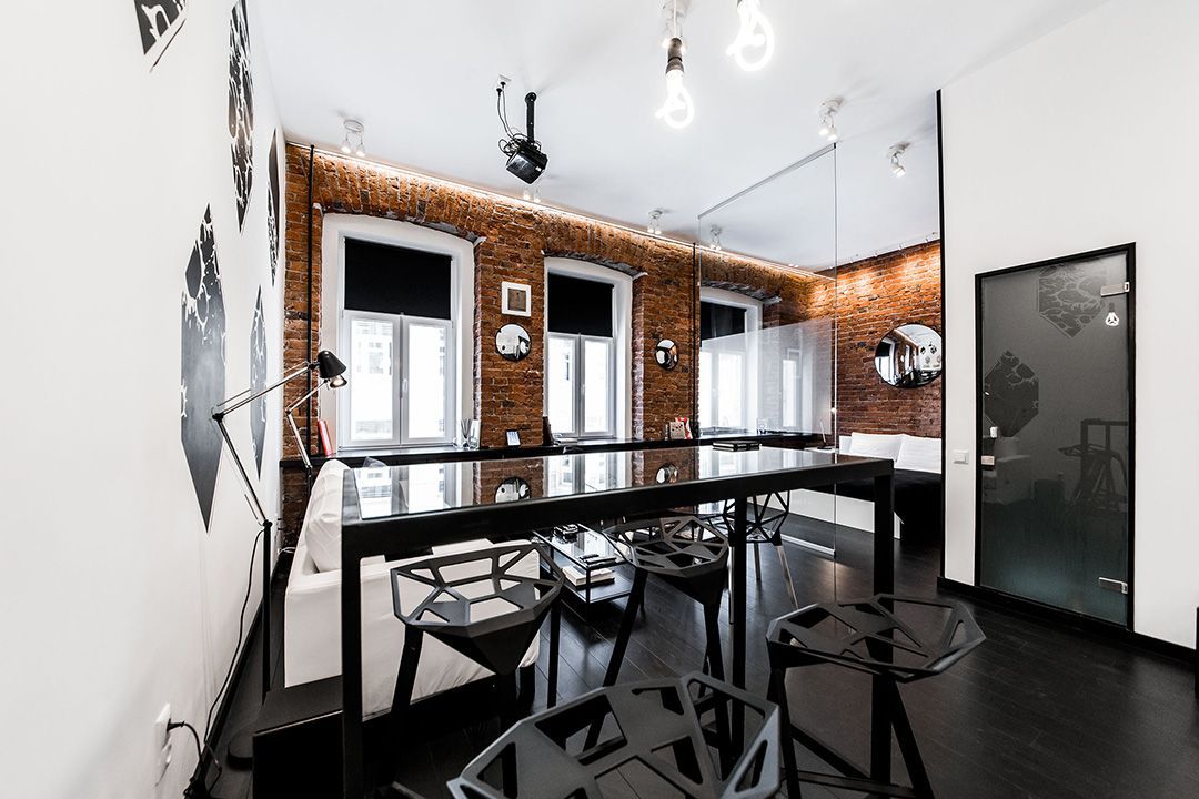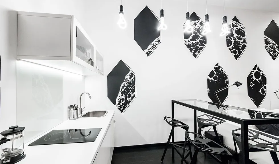 Интерьер квартиры-студии выполнен в строгом, современном стиле и получился практически монохромным, то есть черно-белым. Стены украсили рисунки в космической тематике, заметной деталью стали стулья необычной формы. В интерьере присутствуют отсылки к советскому авангардизму, например, на одну из стен студии нанесены рисунки, изображающие окна легендарного дома Мельникова - знаменитого советского архитектора-авангардиста.