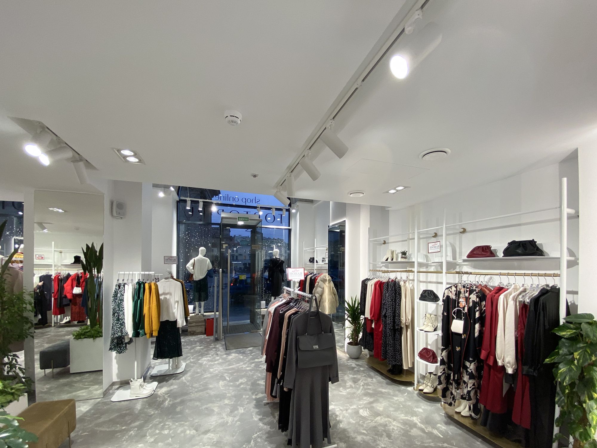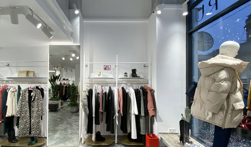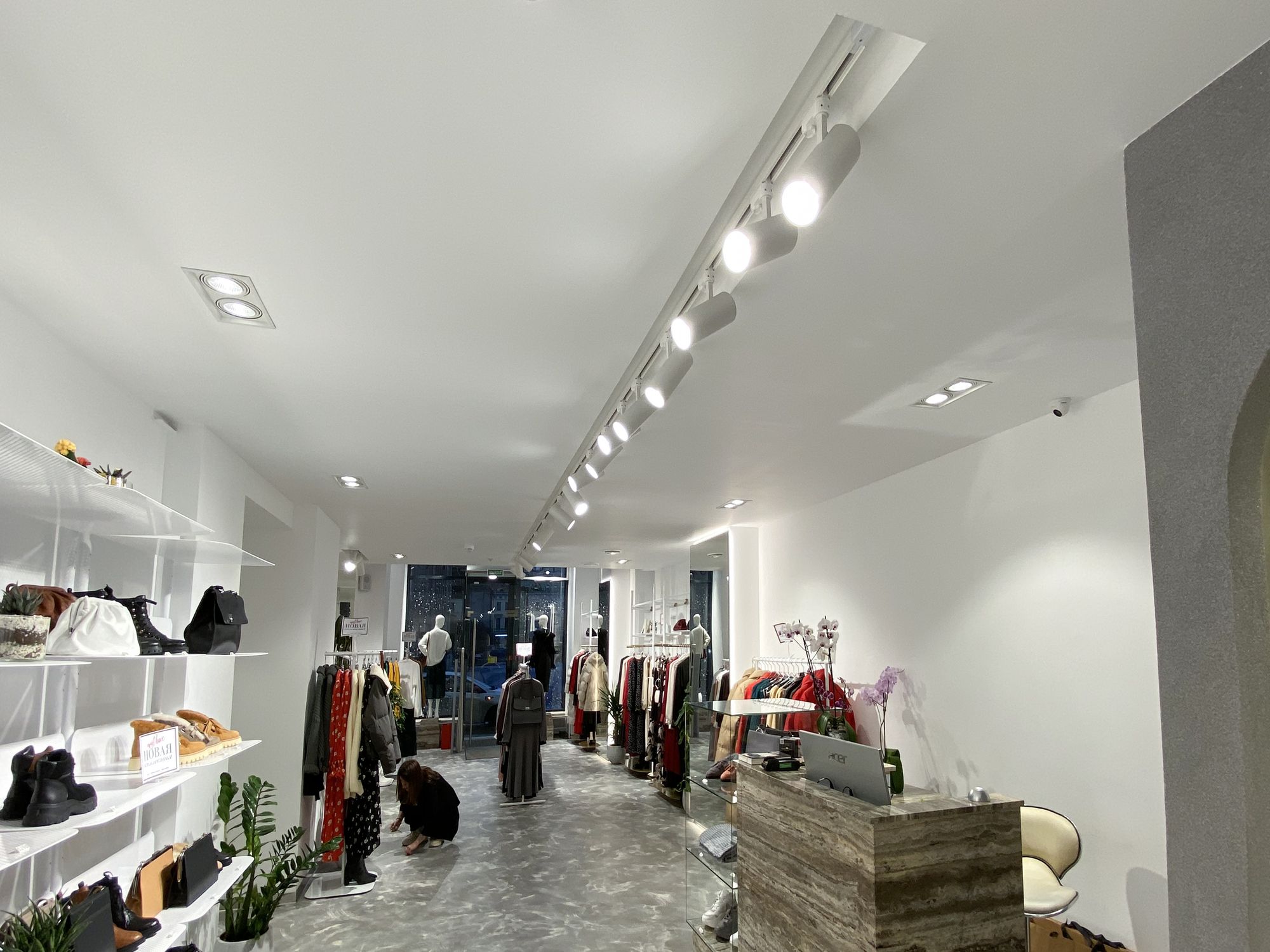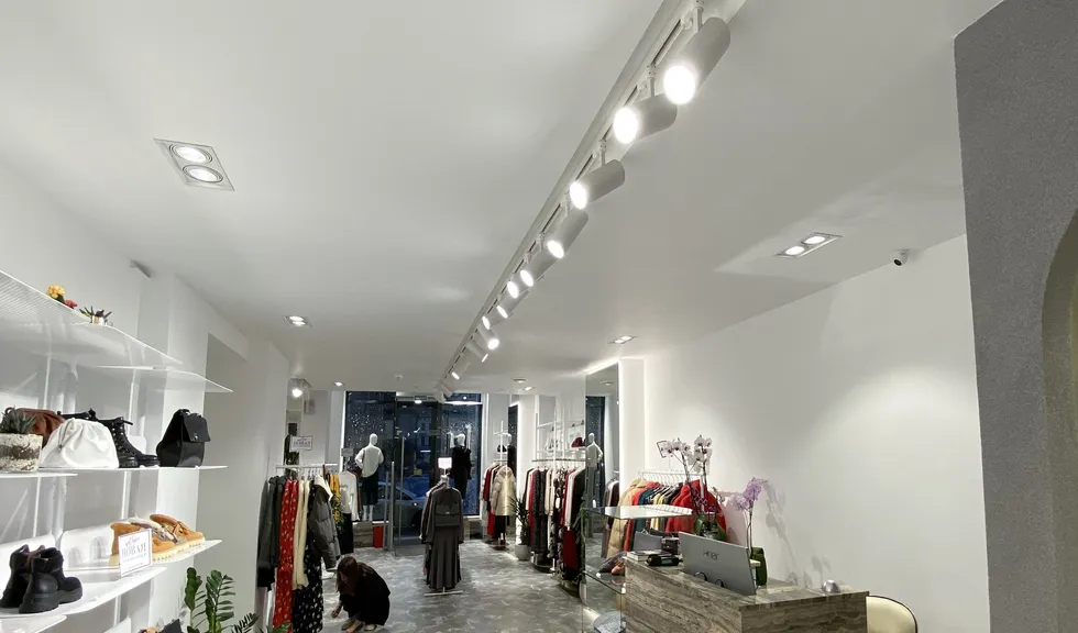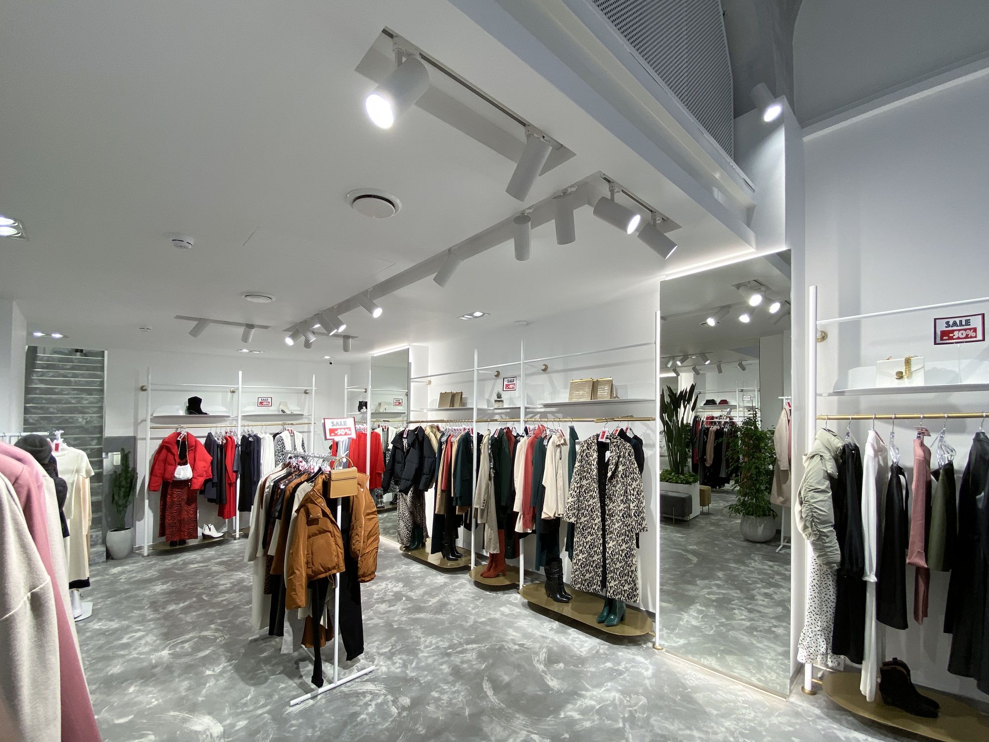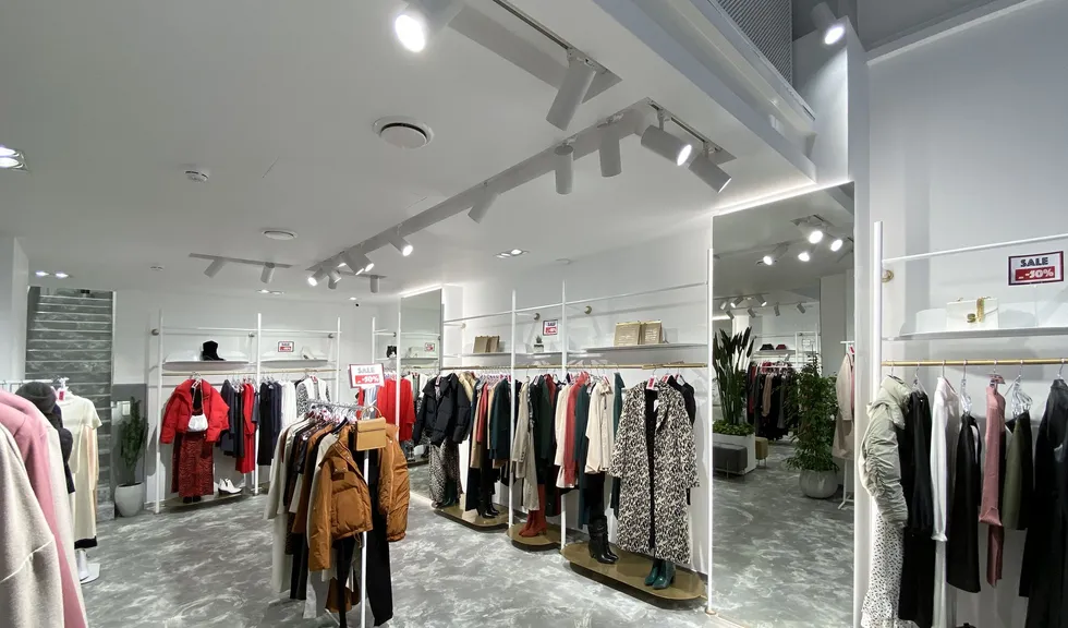 В проекте использованы подвесные светильники для треков/шин и светодиодные ленты с белым свечением. За счет высокого индекса цветопередачи достигается идеальный свет, который помогает подчеркнуть фактуру и цвет вещей, мотивируя посетителей на покупки. В помещении легко менять направление света — трековые светильники быстро перемещаются вдоль шины и позволяют расставлять световые акценты там, где это необходимо, что особенно удобно при смене сезонных коллекций.