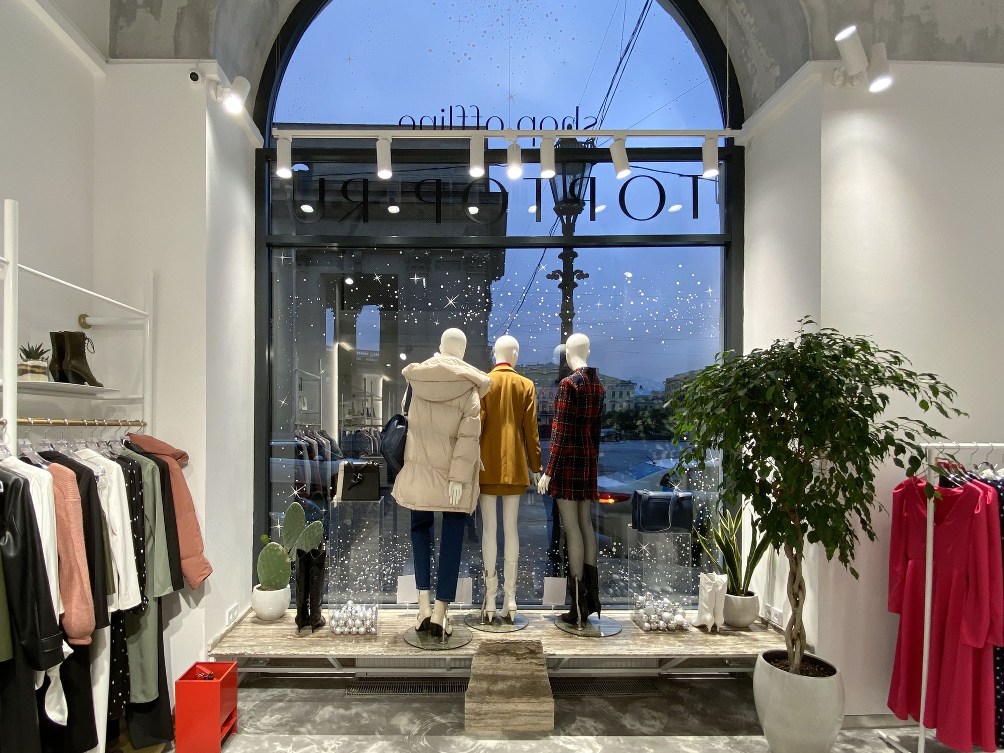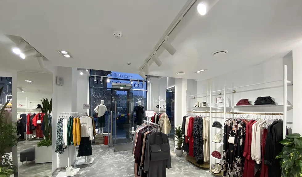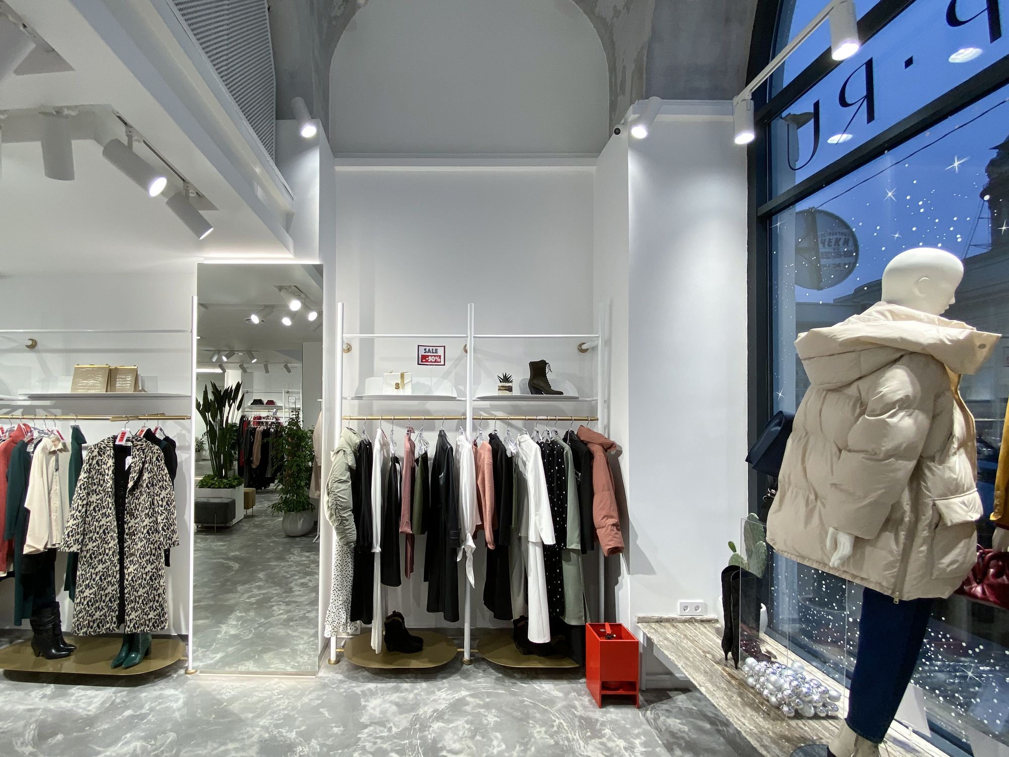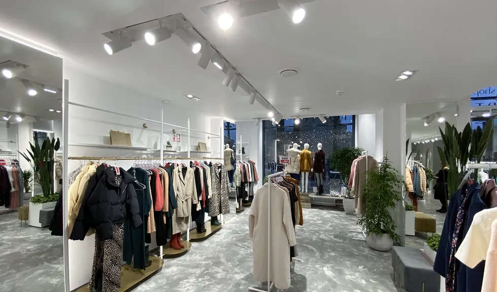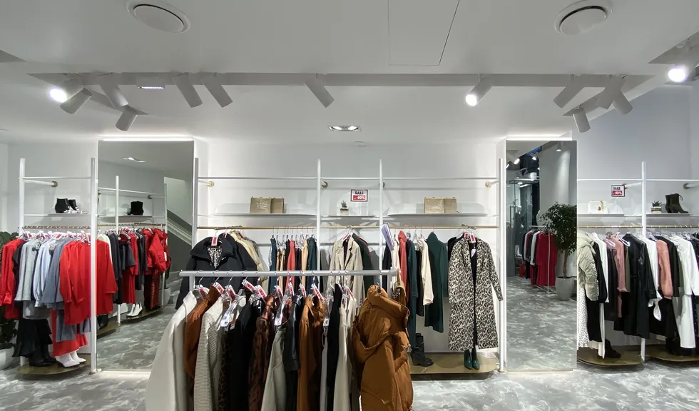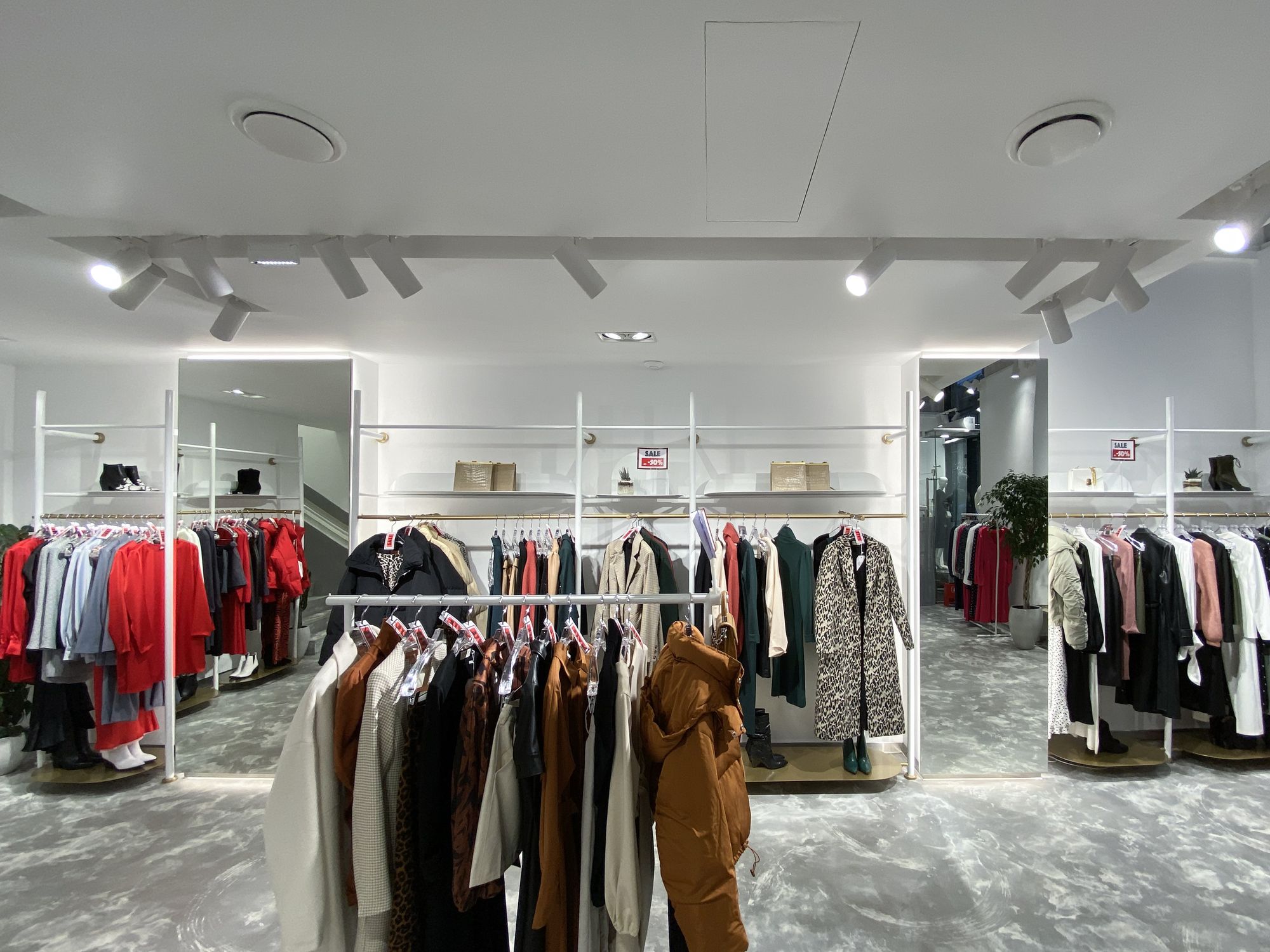 В проекте использованы подвесные светильники для треков/шин и светодиодные ленты с белым свечением. За счет высокого индекса цветопередачи достигается идеальный свет, который помогает подчеркнуть фактуру и цвет вещей, мотивируя посетителей на покупки. В помещении легко менять направление света — трековые светильники быстро перемещаются вдоль шины и позволяют расставлять световые акценты там, где это необходимо, что особенно удобно при смене сезонных коллекций.