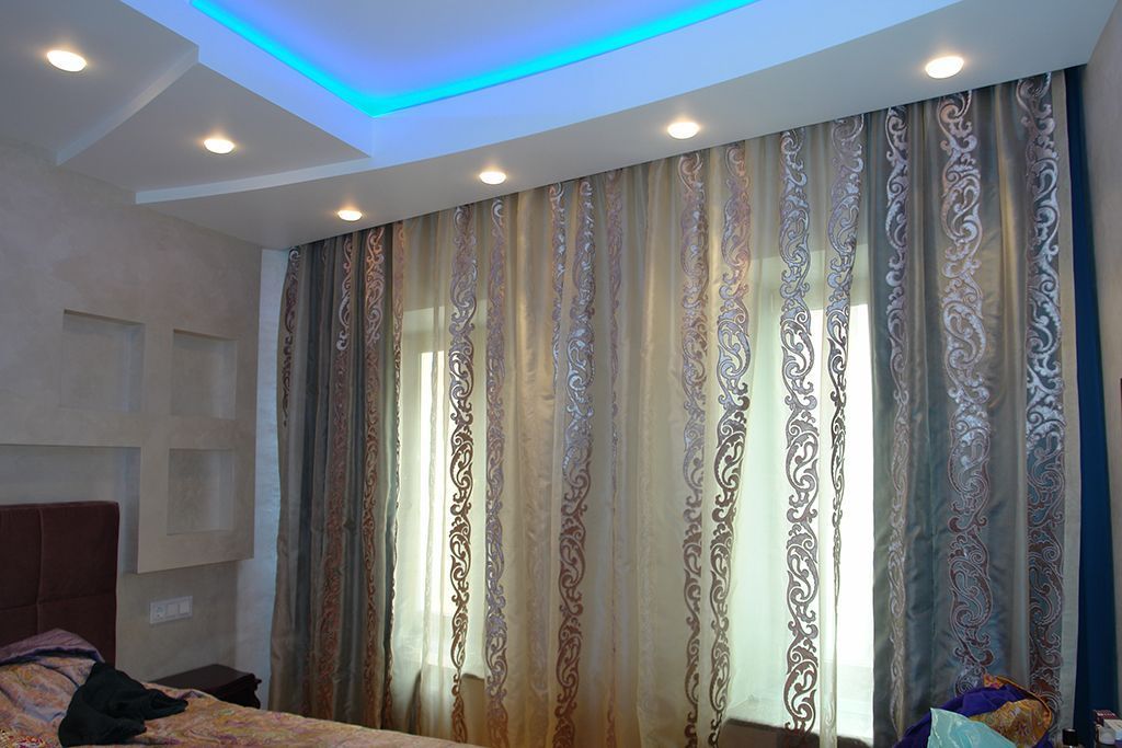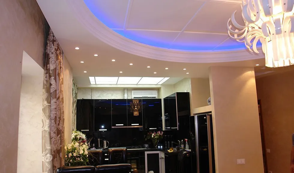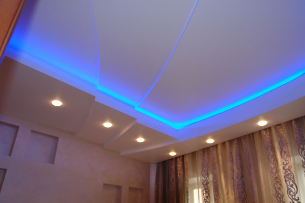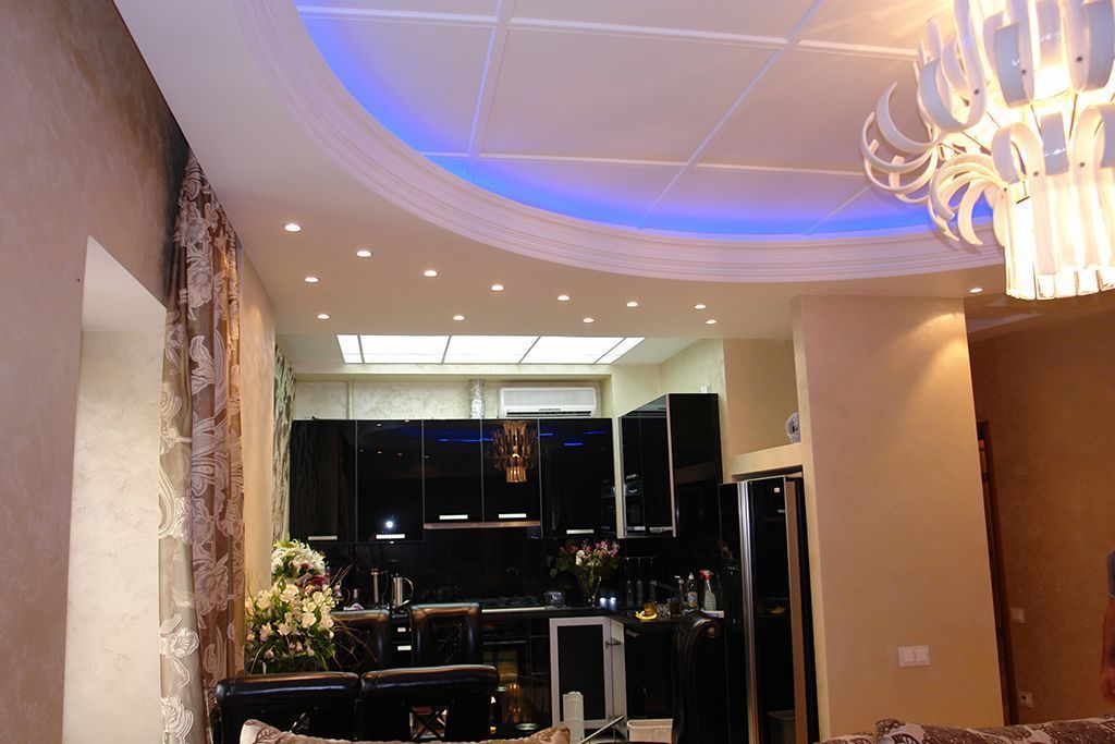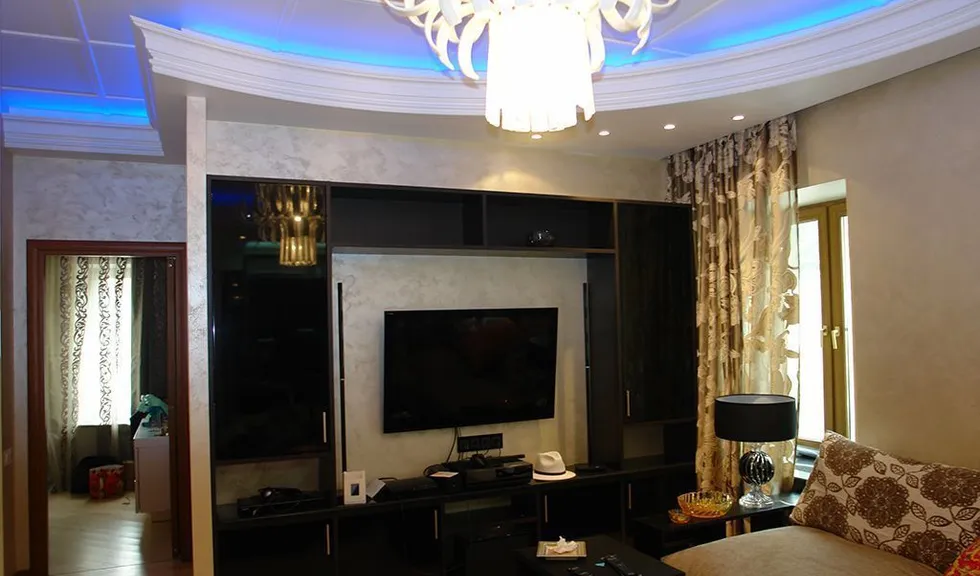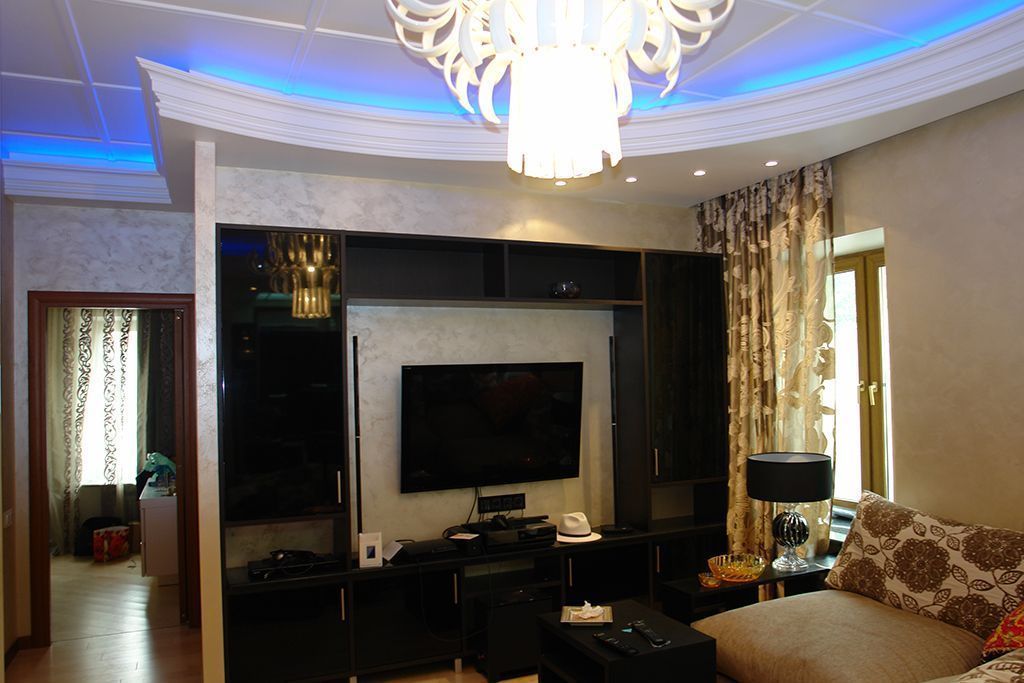 По периметру гостиной расположился карниз, украшенный декоративной лепниной. В нём была установлена светодиодная лента arlight® синего свечения. Такая же лента была применена в подсветке многоуровневого потолка спальной комнаты.