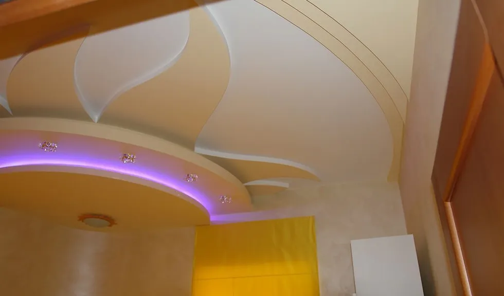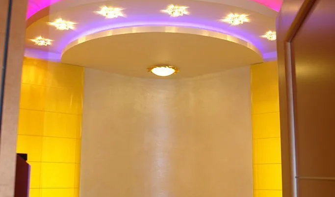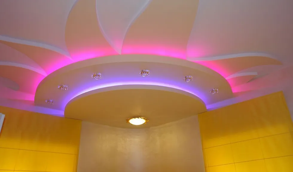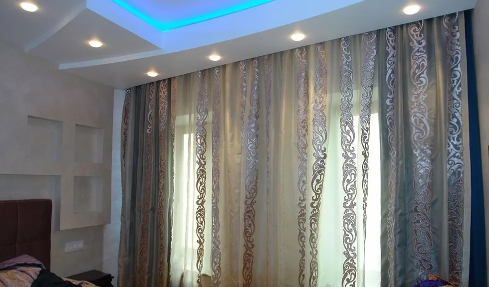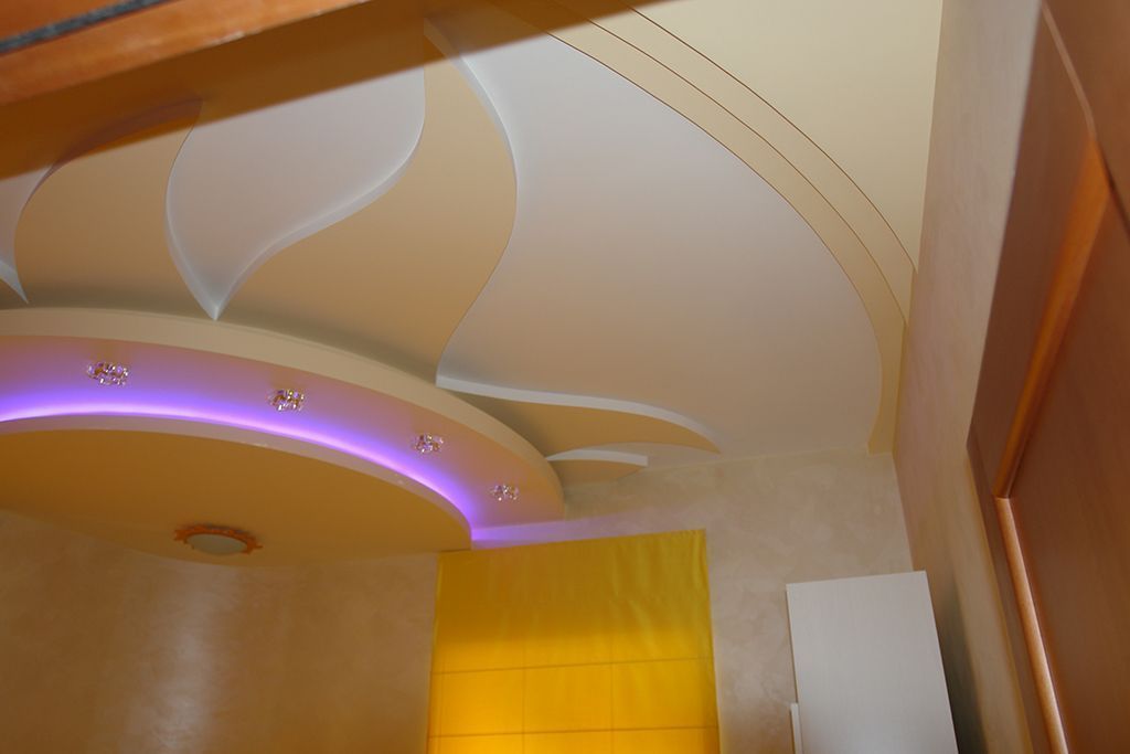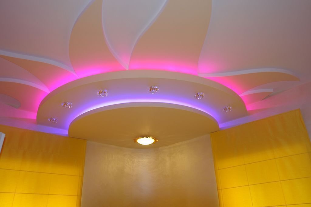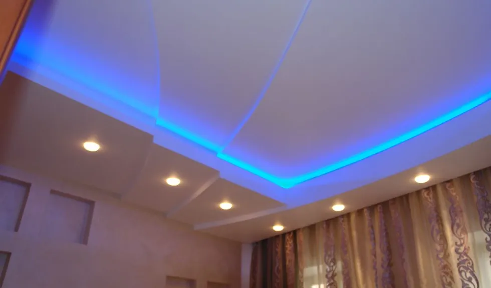 По периметру гостиной расположился карниз, украшенный декоративной лепниной. В нём была установлена светодиодная лента arlight® синего свечения. Такая же лента была применена в подсветке многоуровневого потолка спальной комнаты.