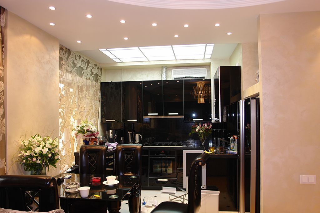Освещение рабочей зоны кухни было выполнено способом витражной подсветки. Над светопропускающим пластиком (оргстеклом) была с равными промежутками наклеена светодиодная лента. Таким образом создаётся необычный эффект светящейся поверхности потолка. Над обеденной зоной заняли своё место точечные светильники.