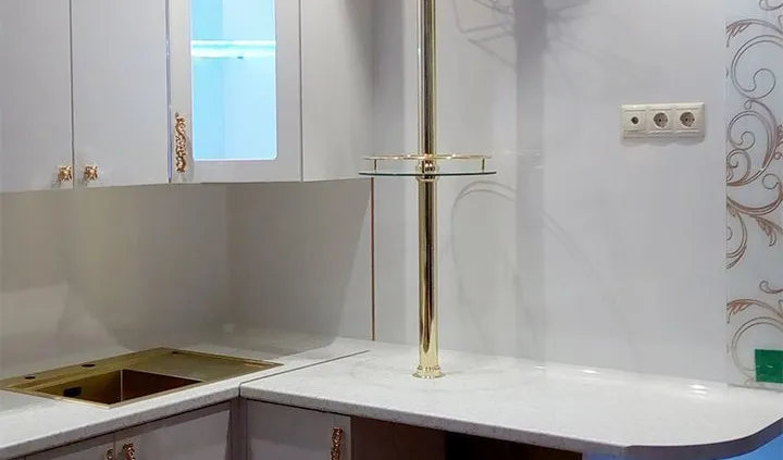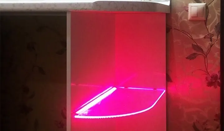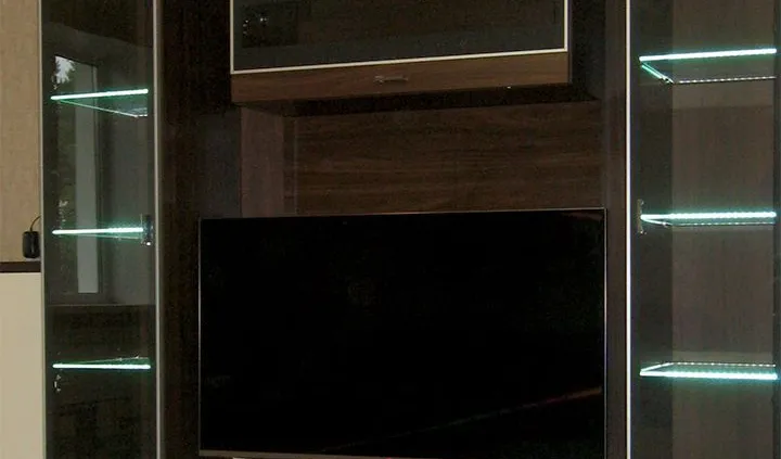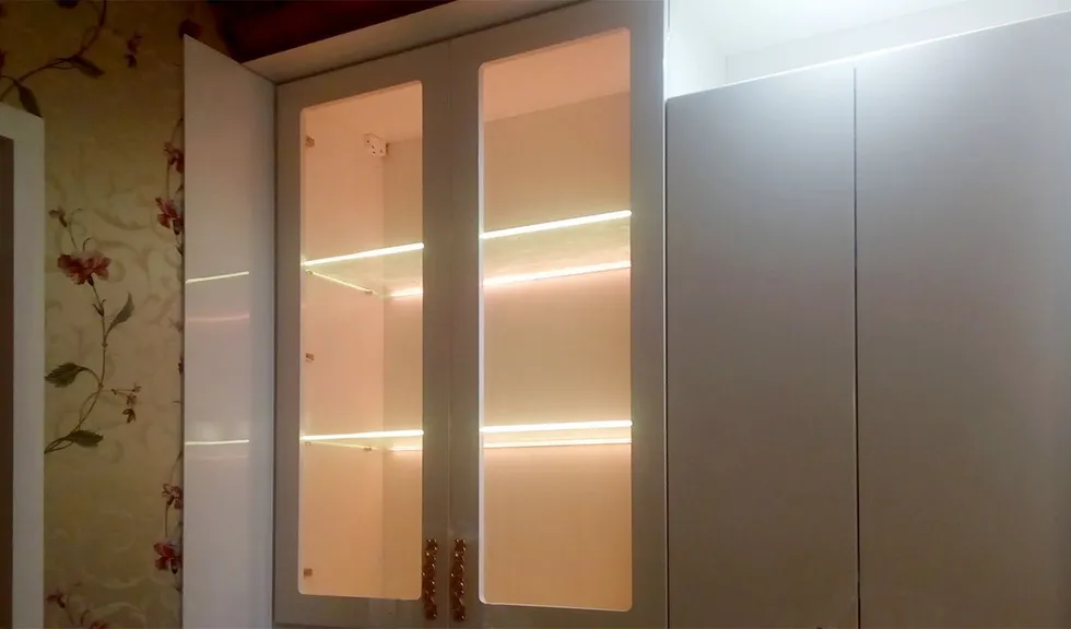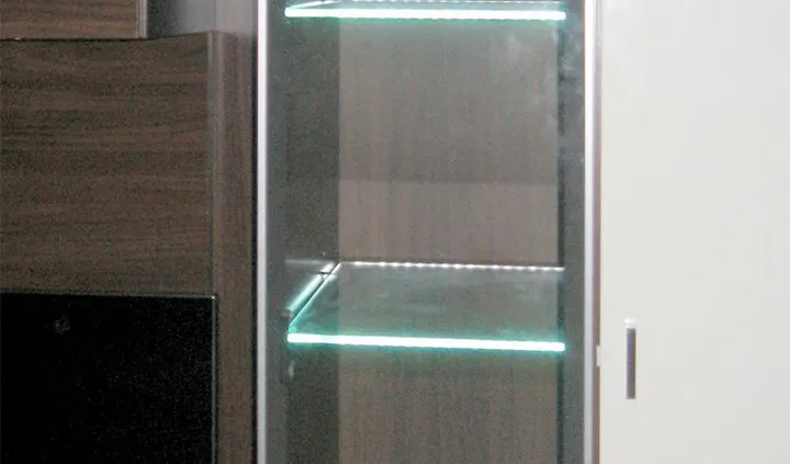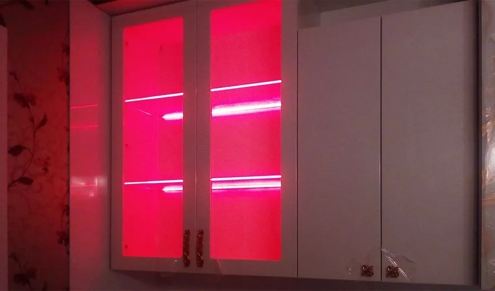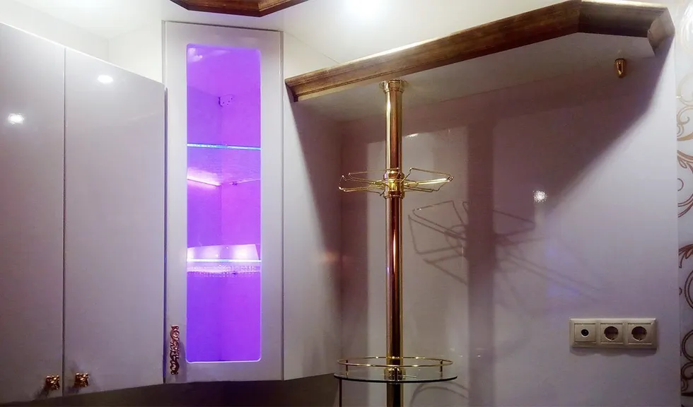 В данном проекте применена многоцветная RGB светодиодная лента, управление которой осуществляется дистанционно, при помощи небольшого сенсорного пульта. Яркость ленты позволила подсветить не только само стекло, но и пространство внутри шкафов. Такая подсветка смотрится весьма эффектно и способна подчеркнуть красоту предметов, размещённых на стеклянных полках.