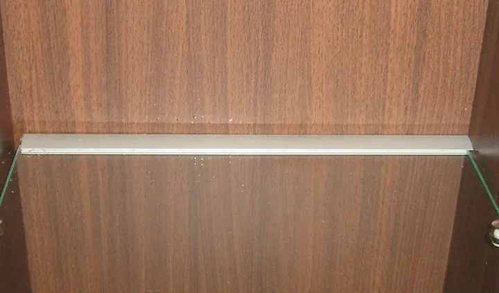Для реализации подсветки стеклянных полок был применён специальный светодиодный профиль. Он устанавливается на кромку стекла со стороны примыкания к стенке шкафа, поэтому совершенно не бросается в глаза и аккуратно скрывает источник света - светодиодную ленту.