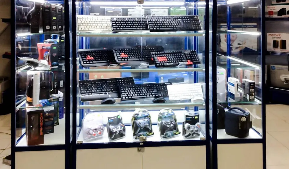 Подсветка стеклянных витрин в компьютерном магазине OLDI.
