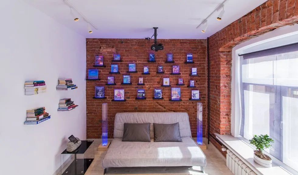 Дальнюю стену помещения разбавили небольшими книжными полками с боксами из плексигласа, в которые вложены книги, все эти боксы также имеют подсветку.