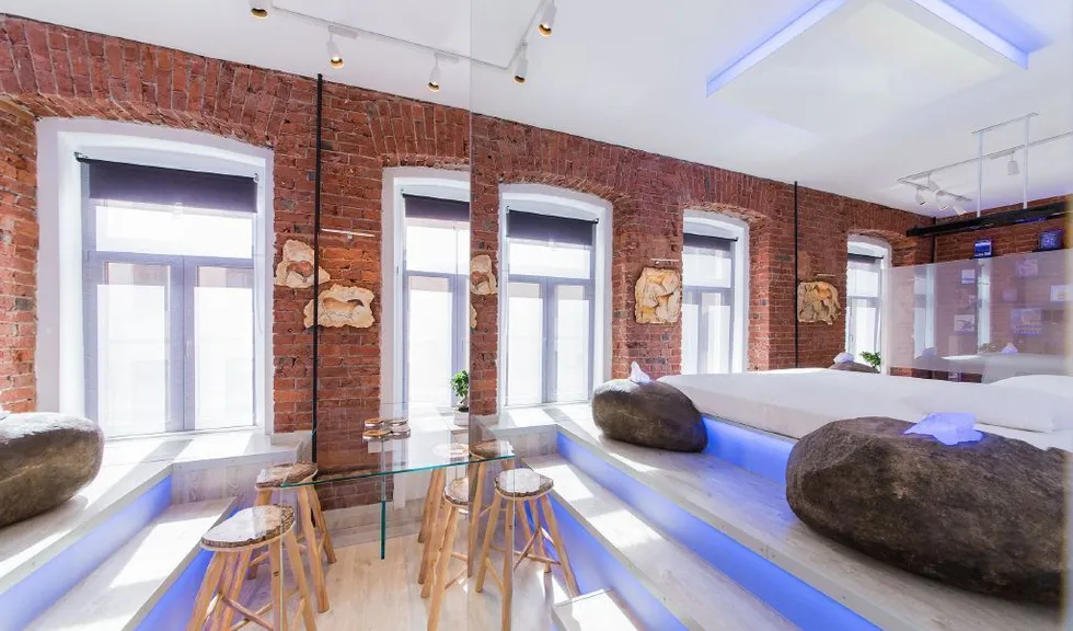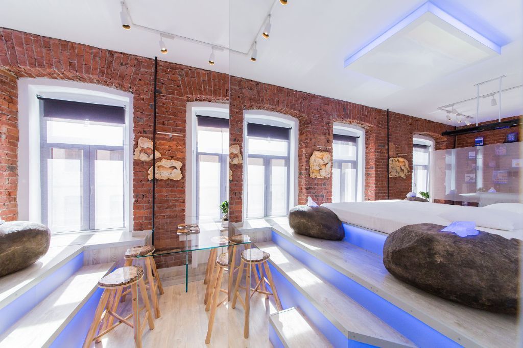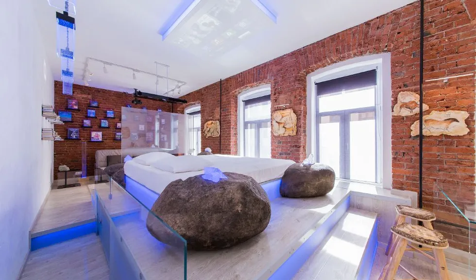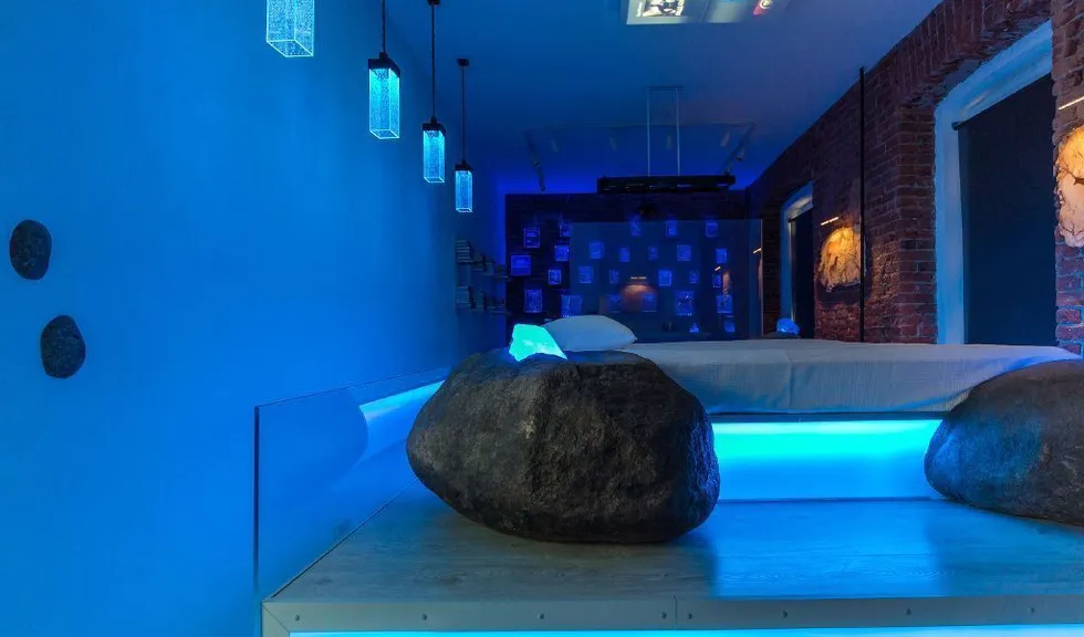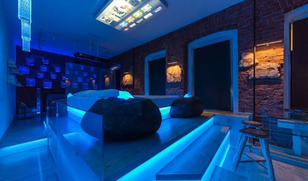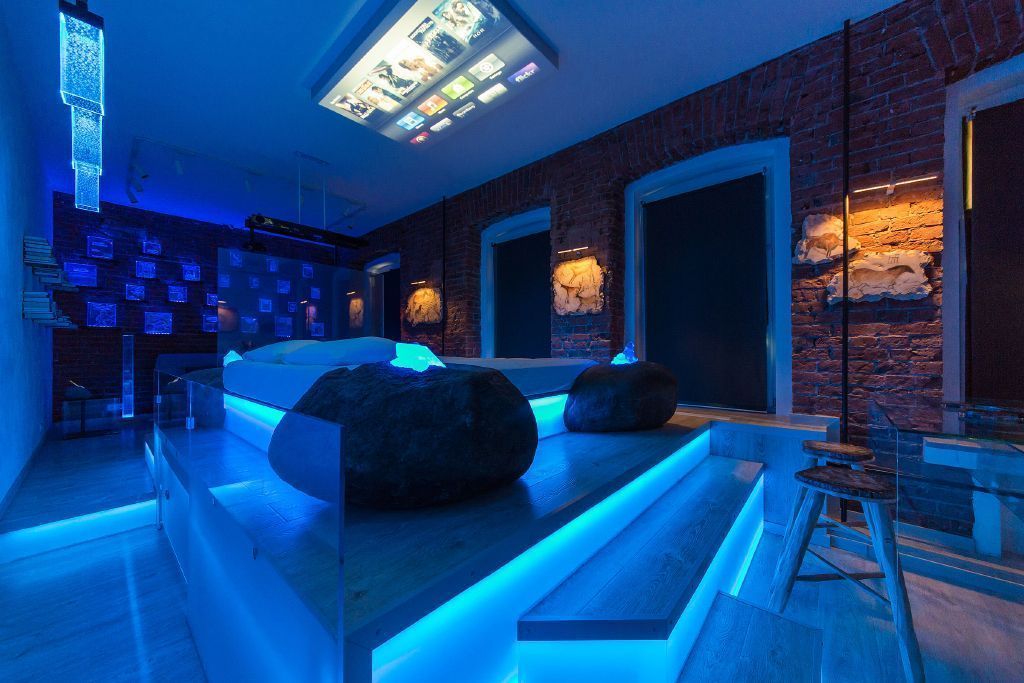 Прямо над кроватью была установлена объемная конструкция, выполняющая роль экрана для проектора, который получил фоновую подсветку. По углам кровати разместились большие камни, в которые буквально "вросли" кристаллы, также получившие светодиодную подсветку.