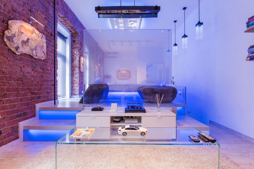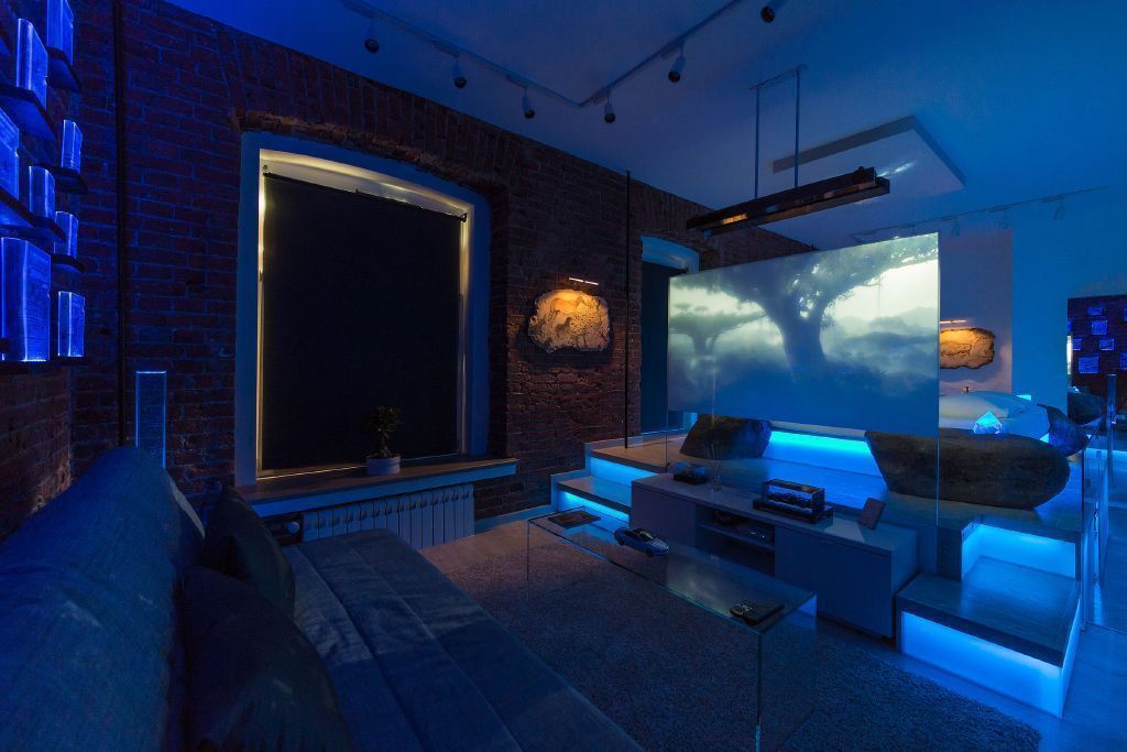 Для создания особой атмосферы в квартире-студии был выбран синий цвет светодиодной подсветки.