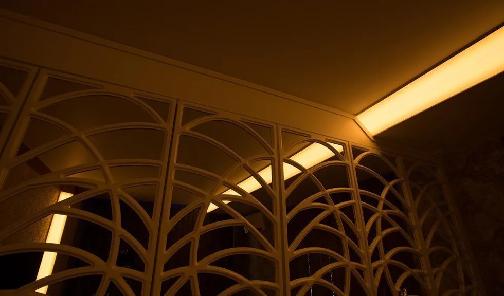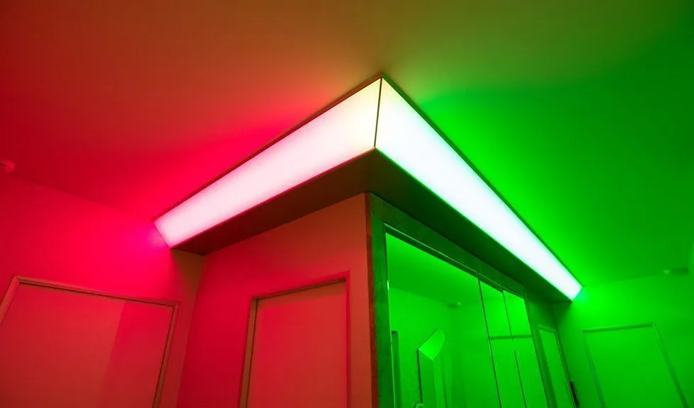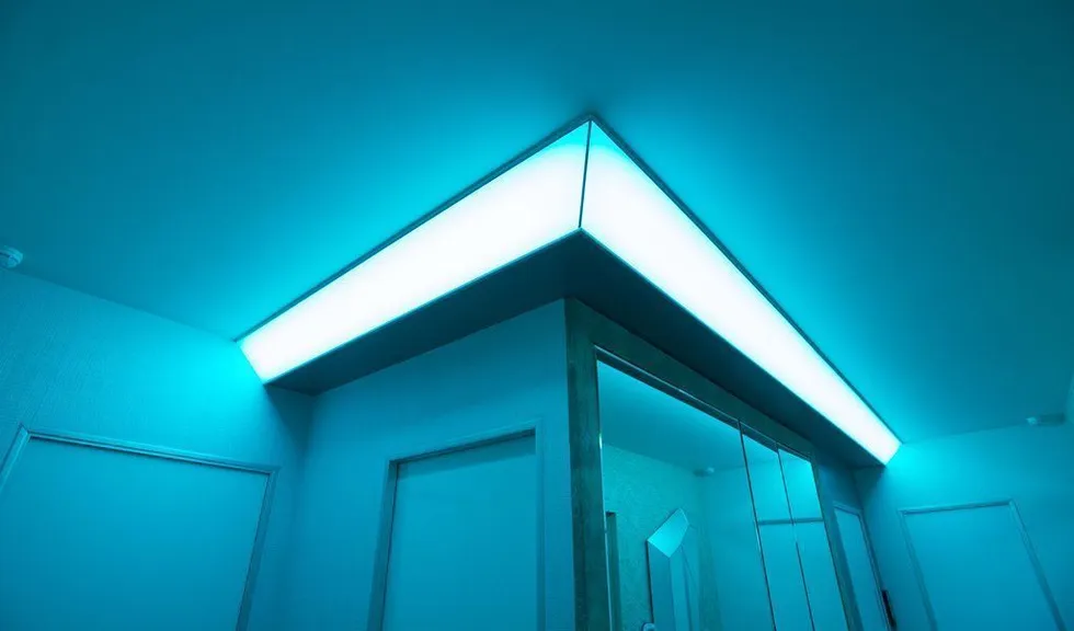 В прихожей освещение также строится на мягкой подсветке скрытой за матовыми пластиковыми панелями. Особенно интересно там смотрится смена цветов RGB-ленты arlight®, многократно отражающаяся в мозаике из зеркал.