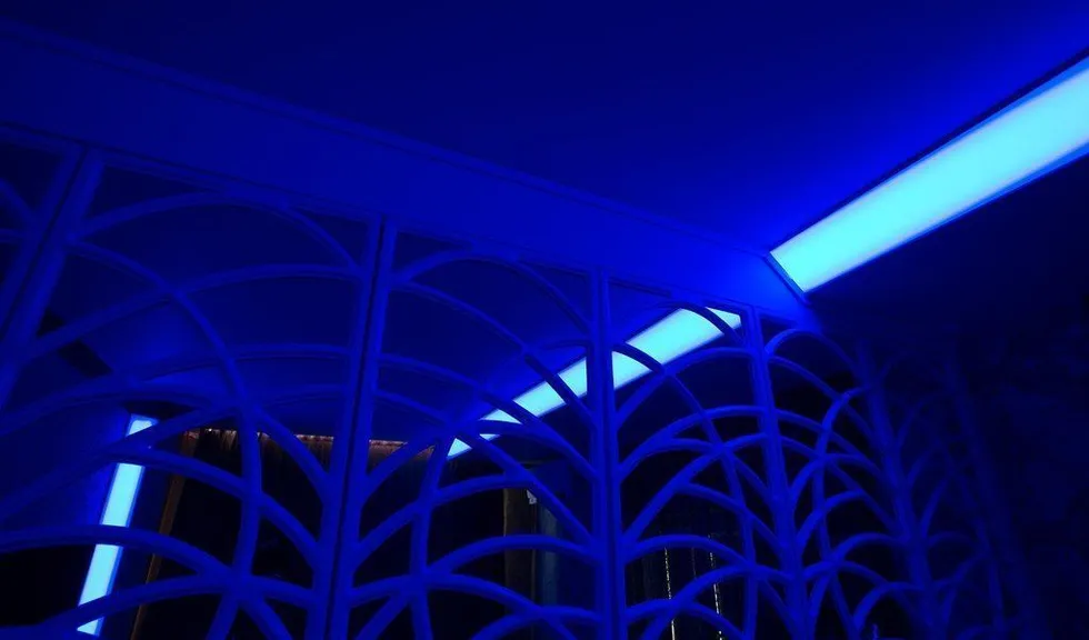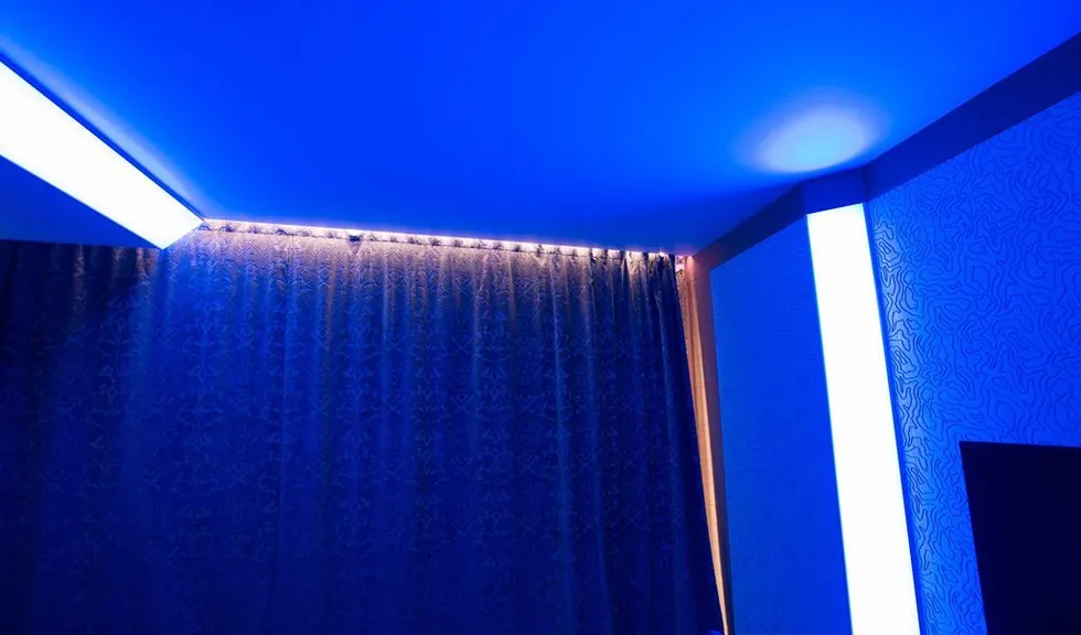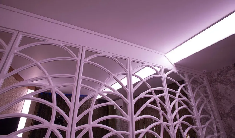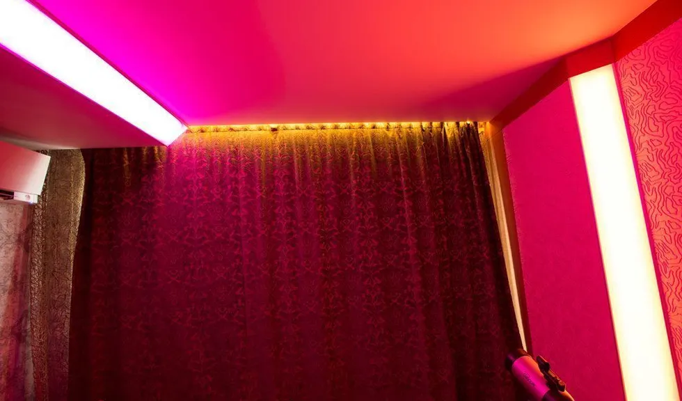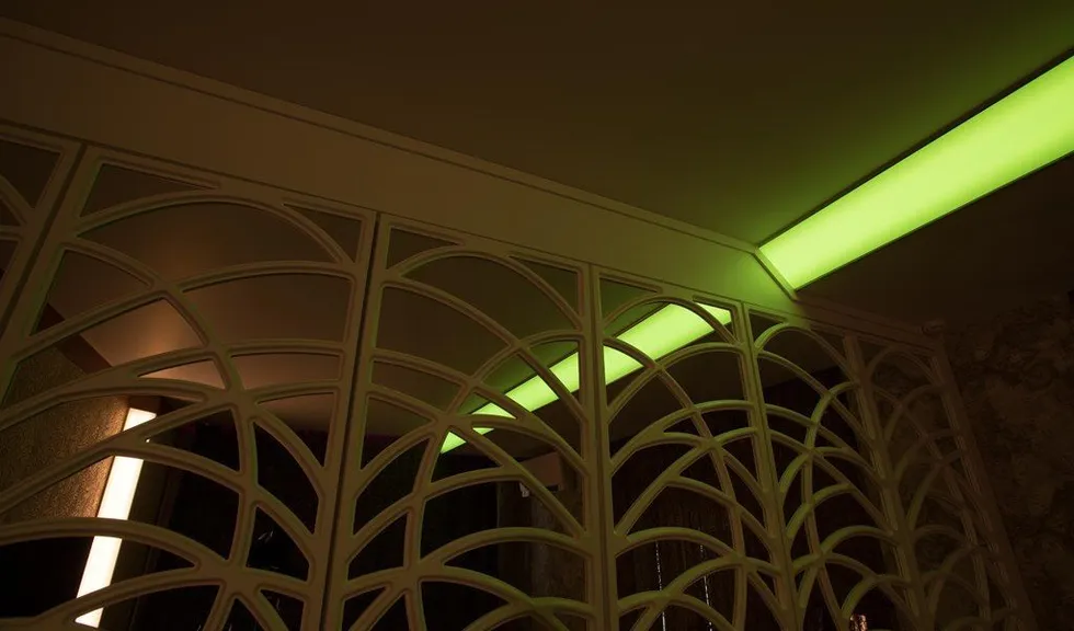 Но основное освещение в комнате не ограничивается широкой световой полосой. Одна из стен, где расположено окно, также украшена тонкими полосками с многоцветными светодиодными лентами arlight®, которые закреплены с помощью врезного алюминиевого профиля arlight® и полностью сливаются с плоскостью стены (если я всё правильно поняла). Свет от них не так бросается в глаза, но является приятной изюминкой интерьера. Отражающееся во множестве зеркал лёгкое мерцание создаёт в комнате удивительную атмосферу. Сочетание яркого света основного освещения и лёгкого мерцания декоративной подсветки