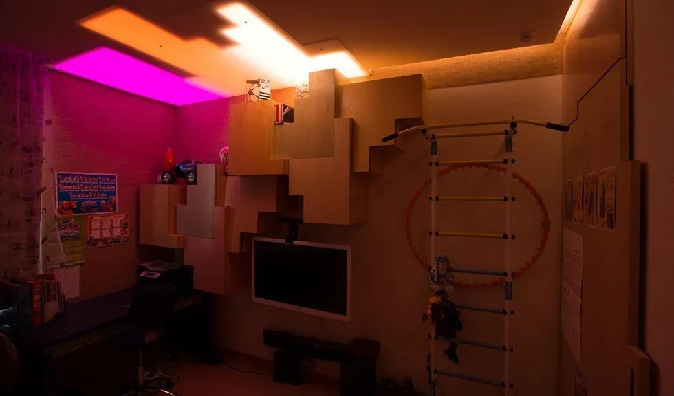 Освещение комнаты для подростка достаточно нестаднартно. Основное освещение и здесь решено с помощью светодиодной ленты arlight®. С одной стороны комнаты в гипсокартонном потолке предусмотрены специальные ниши геометрической формы, внутрь которых RGB-лента arlight® вклеена таким образом, чтобы создавалось равномерное свечение. Ниши также закрыты матовым, пропускающим свет, пластиком. Подобная конструкция, как и полосы в остальных комнатах, одновременно обеспечивает и функциональное, и декоративное освещение. По двум сторонам детской с помощью гипсокартонного потолка образована узкая ниша, в которой также разместилась RGB-подсветка.