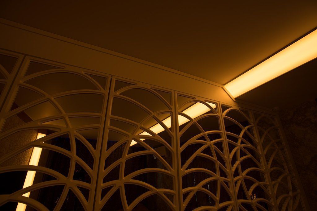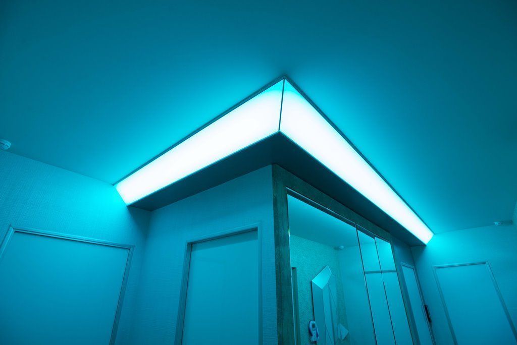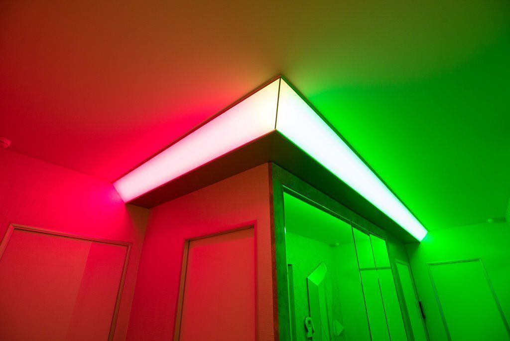 Кроме того вся подсветка в проекте выполнена с помощью многоцветной светодиодной ленты arlight®. Что значительно расширяет декоративные возможности освещения такого рода. Управление освещением происходит с помощью специального пульта с круговой панелью, вращение которой помогает легко и просто выбрать один и тысяч оттенков RGB-ленты.