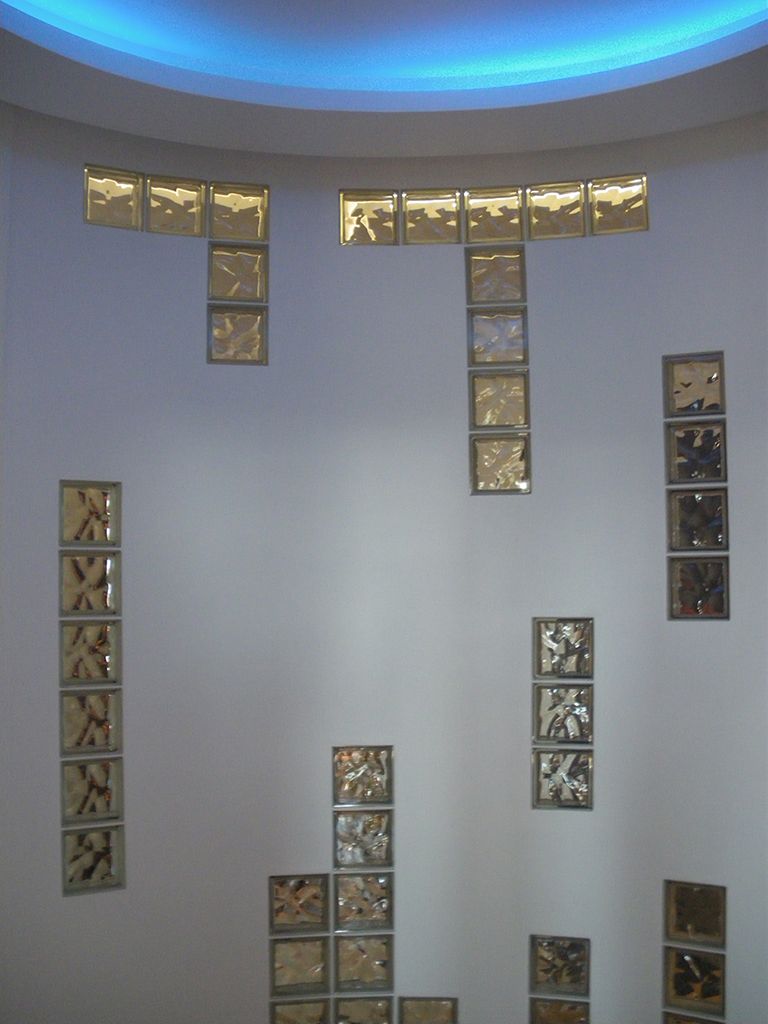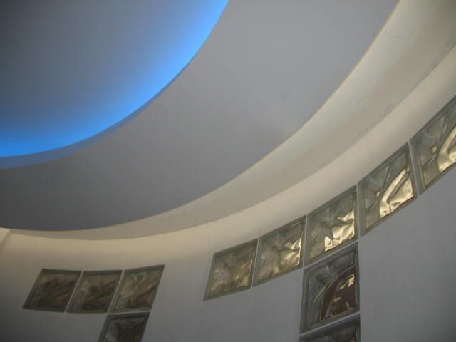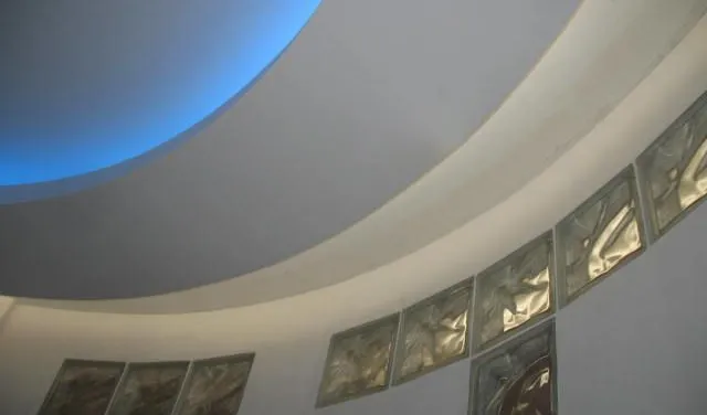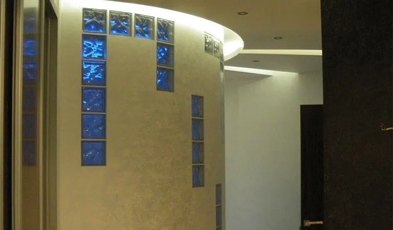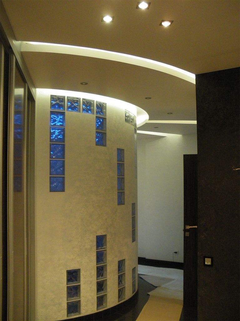 Потолок коридора повторяют его полукруглую форму и разделен на секции, каждая из которых подсвечена при помощи светодиодной ленты. Для этого была выбрана светодиодная лента с дневным белым свечением, поэтому она служит не только для декоративной подсветки, но и для мягкого фонового освещения, которое не напрягает глаза, например, ночью. Такой же цвет подсветки был выбран и для подсветки в комнатах.