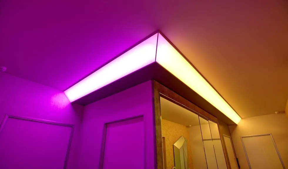 Первый вариант - закарнизная подсветка по периметру помещения. Возможны различные варианты исполнения такой подсветки: подсветка только белой светодиодной лентой с диммированием или без диммирования, подсветка только RGB светодиодной лентой с RGB контроллером, также возможно применение одновременно и многоцветной, и белой светодиодной ленты с регулировкой яркости и выбором цвета.