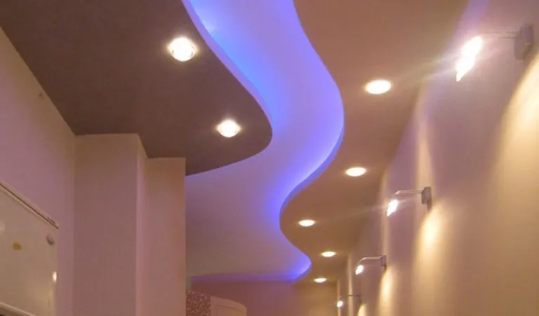 Третий вариант - закарнизная подсветка с точечными светильниками на многоуровневом потолке. Например, один уровень потолка подсвечивается светодиодной лентой, а на другом уровне установлены точечные светодиодные светильники.