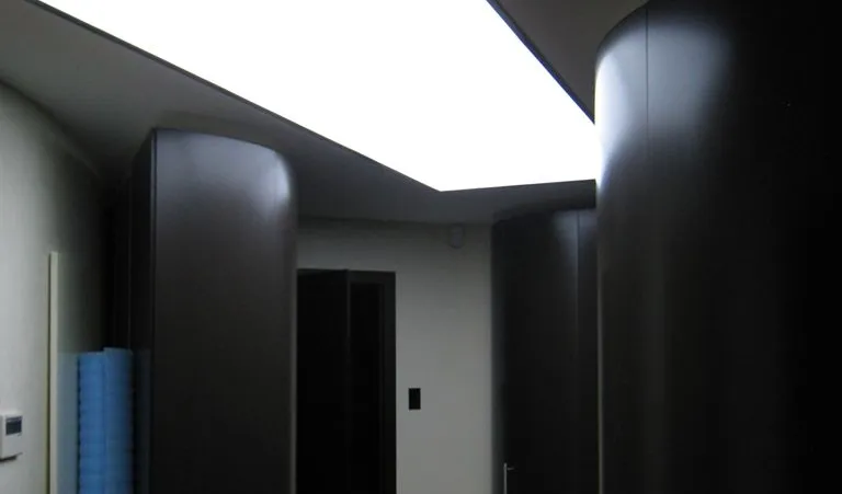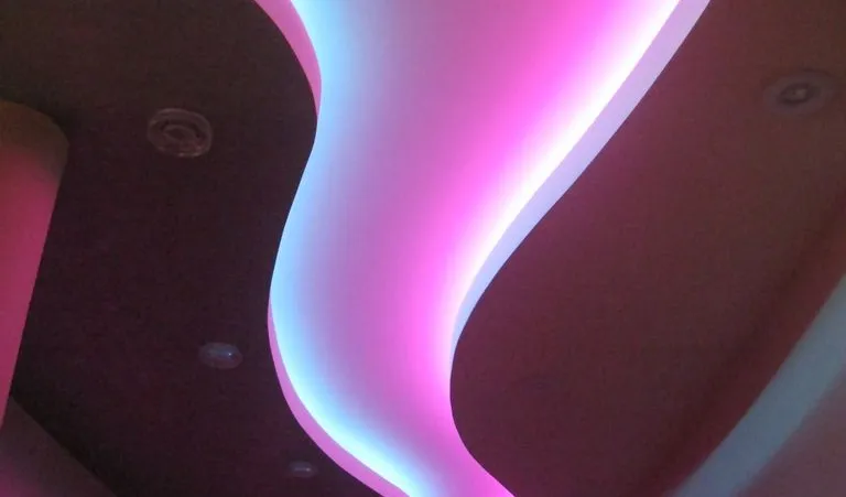 Четвертый вариант - витражная засветка всего потолка или отдельных его участков. При таком способе освещения светодиодная лента устанавливается над полотном светопропускающего натяжного потолка или над светопропускающим пластиком или витражным стеклом.