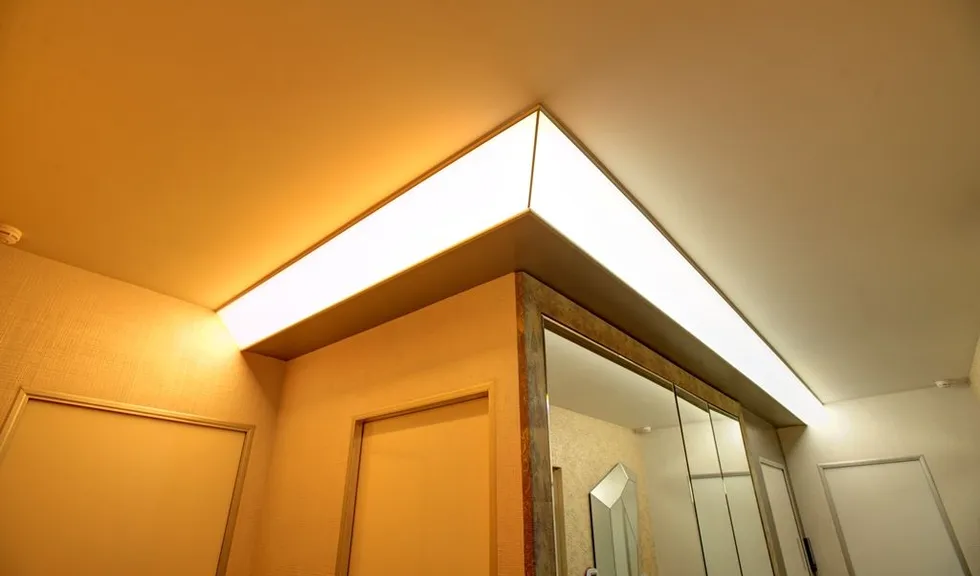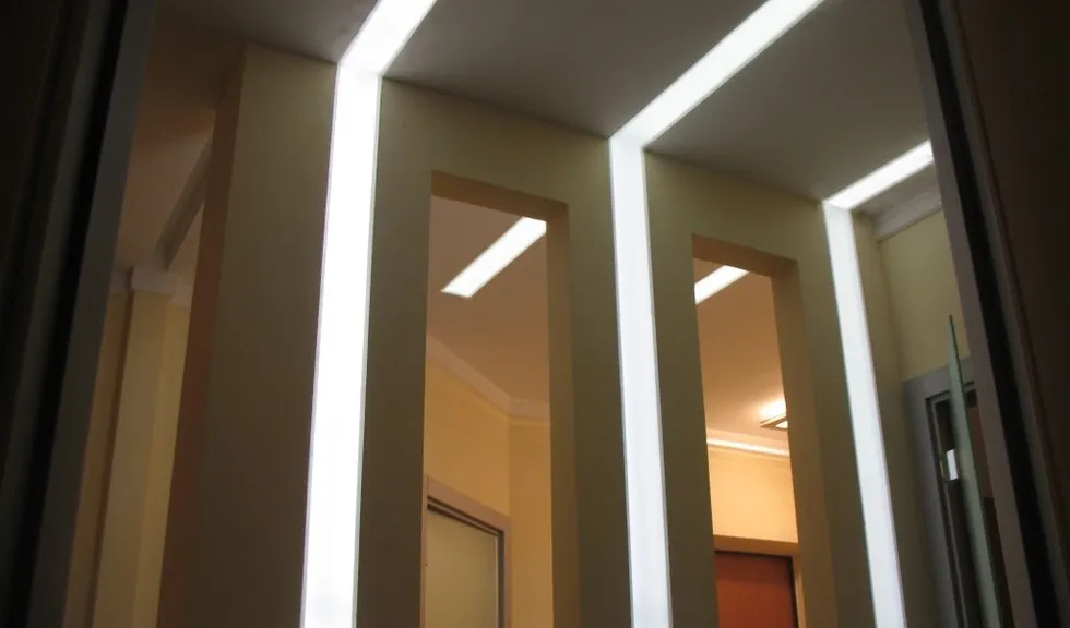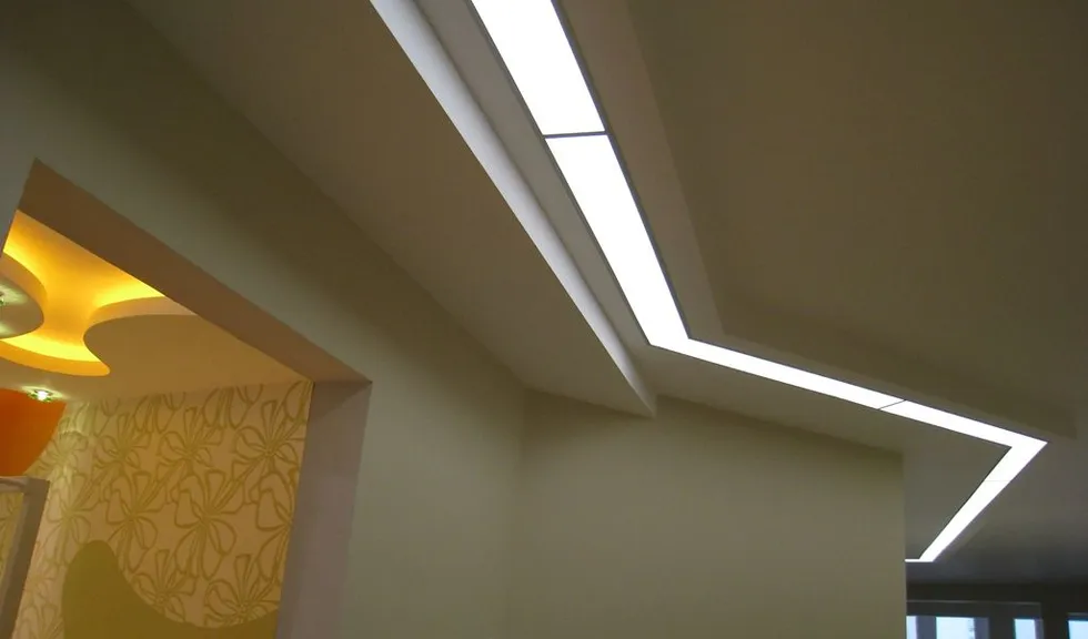 Второй вариант - это различные встроенные в гипсокартоновые ниши линейные светильники со светопропускающим пластиковым экраном или светильники, изготовленные из алюминиевого профиля со светодиодной лентой и закрытые экраном.