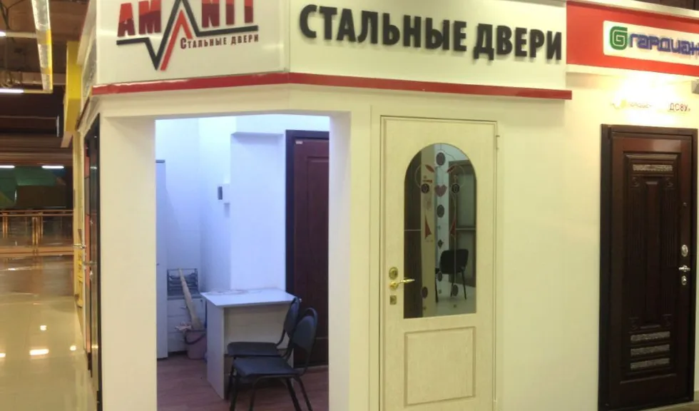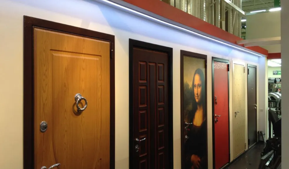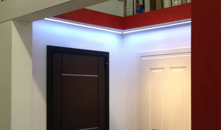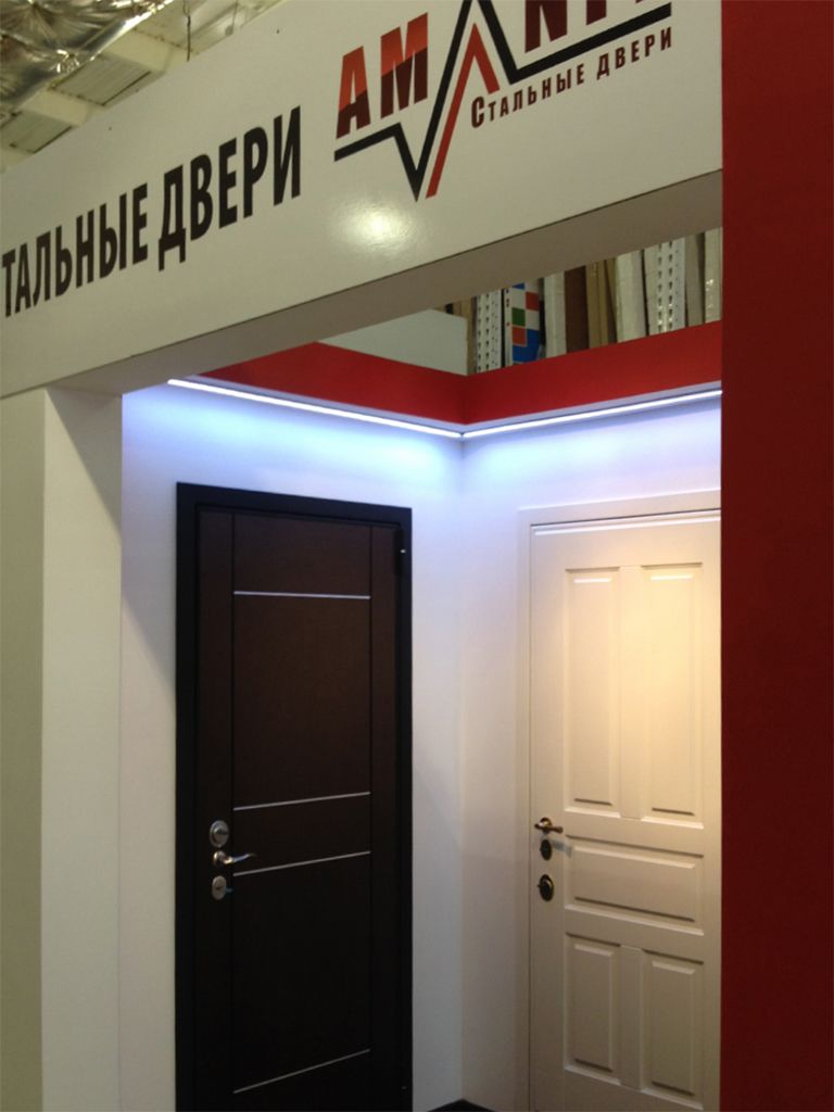 Многоцветная светодиодная подсветка образцов дверей в павильонах торговых центров. Подсветка была выполнена линейными светодиодными светильниками arlight®, изготовленными из алюминиевого профиля с объемным экраном и многоцветной светодиодной ленты arlight®.