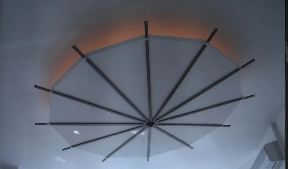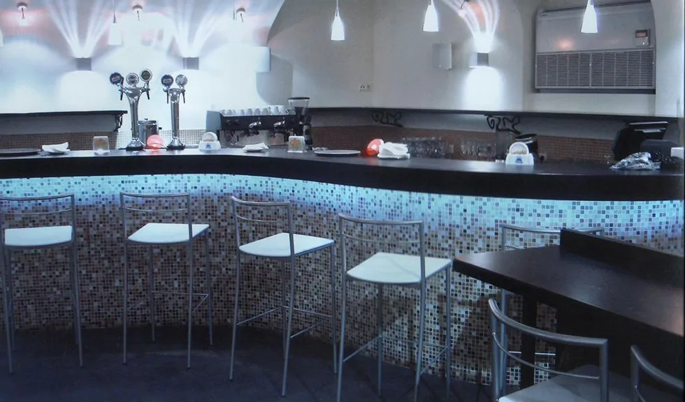 Цветная светодиодная лента arlight® была использована для декоративной подсветки: синяя - для подсветки барной стойки, оранжевая - для подсветки декоративной инсталляции - "зонтика" на потолке.