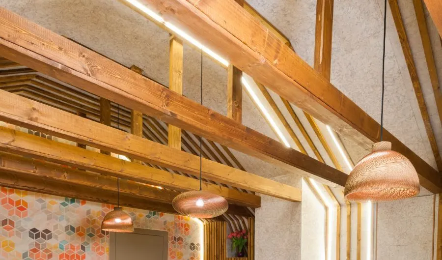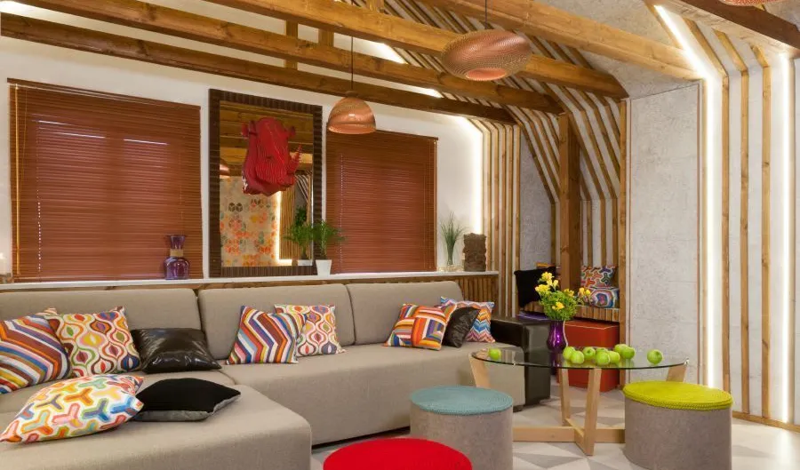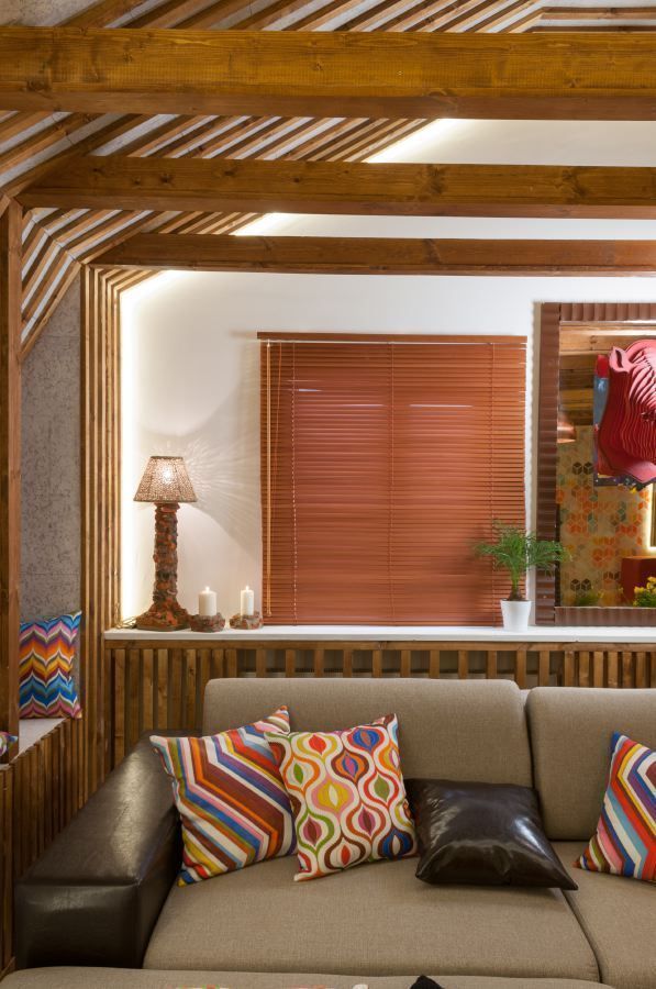 По замыслу дизайнеров стены были выполнены в африканском стиле, различные аксессуары добавили разнообразия красок, а светодиодная лента, проложенная в алюминиевом профиле MIC-2000 Anod между деревянных балок, наполнила все пространство гостиной приятным теплым светом. Высокий световой поток ленты сделал помещение ярким, радостным и уютным.
