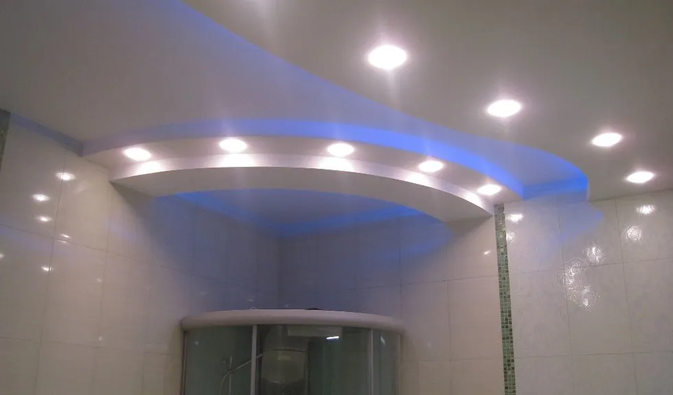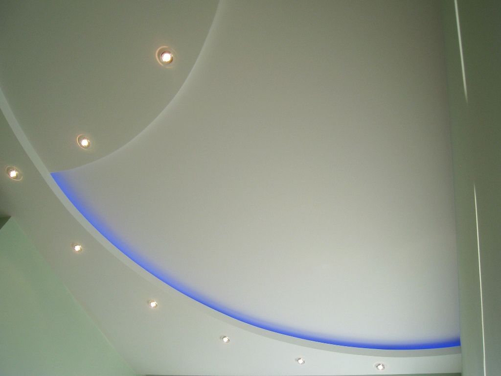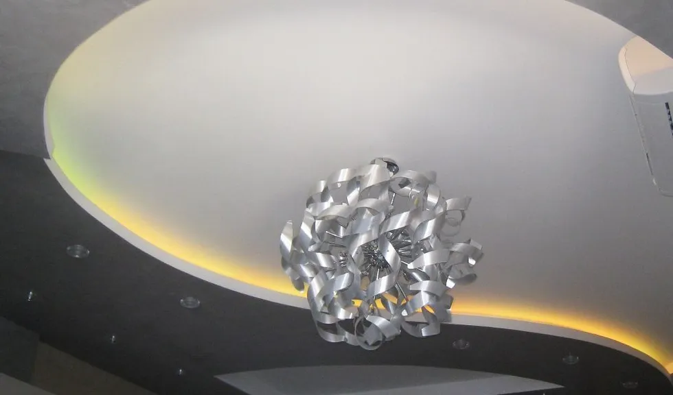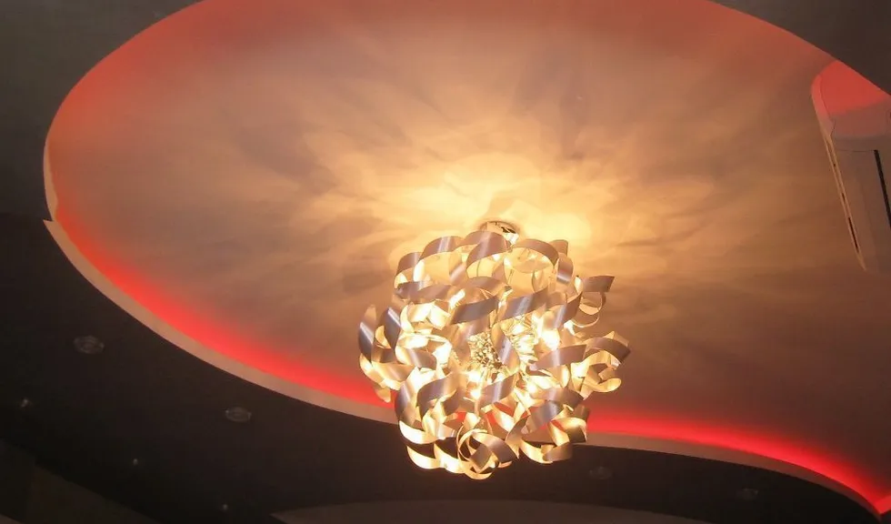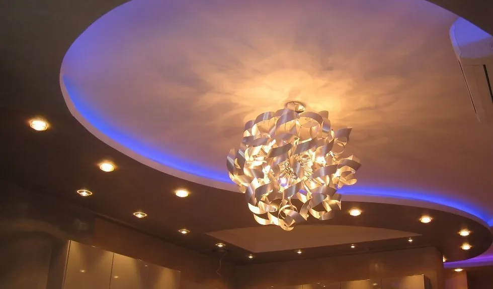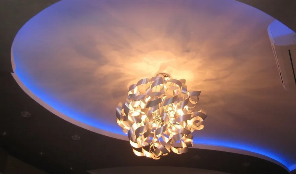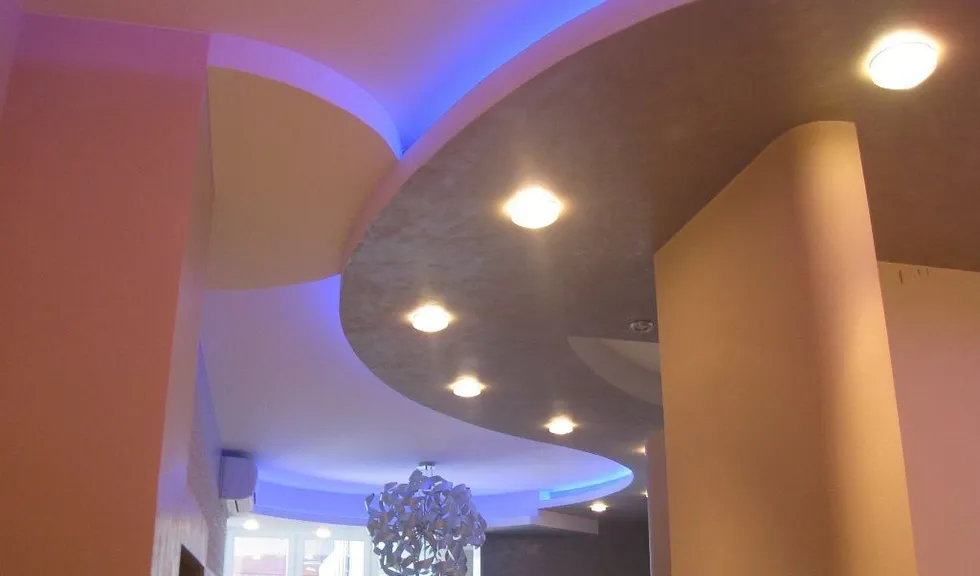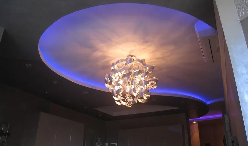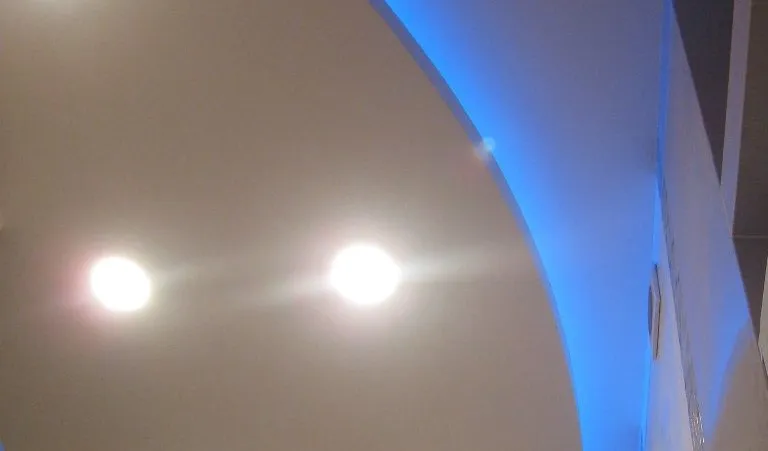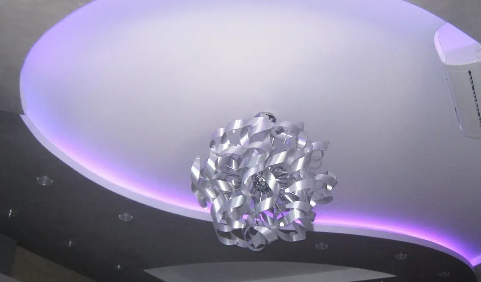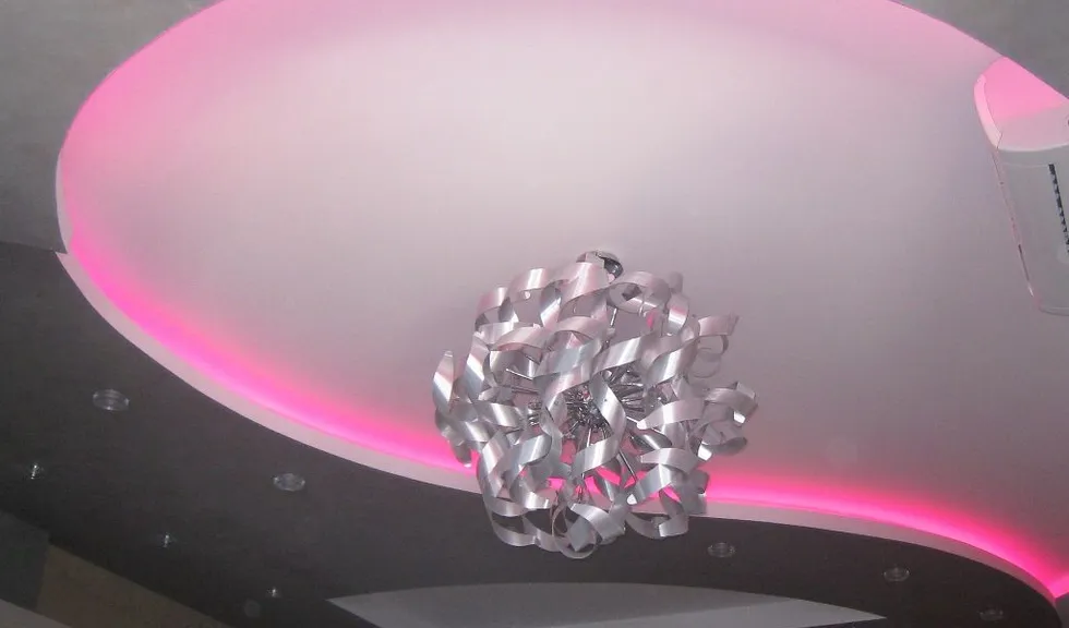 Сочетание люстры, точечных светильников и цветной светодиодной ленты arlight® в зале.