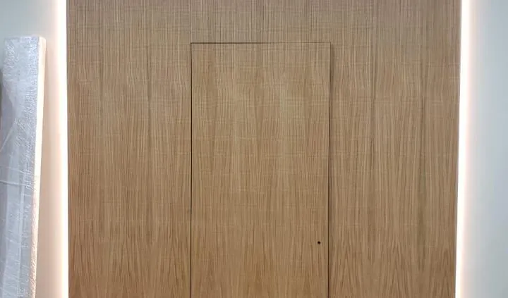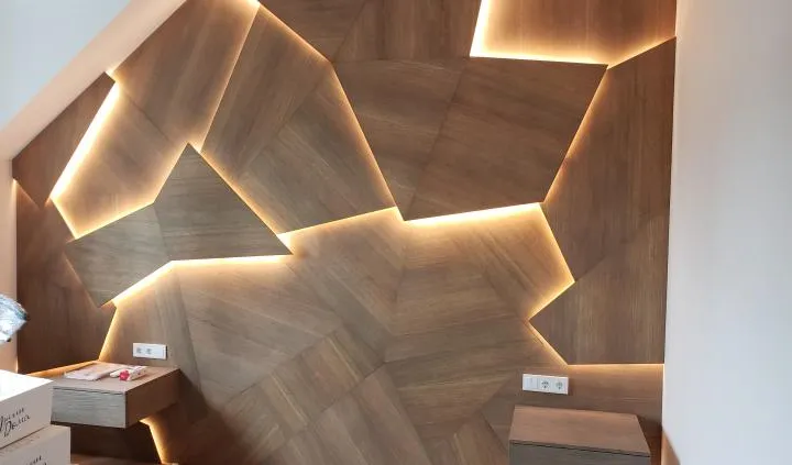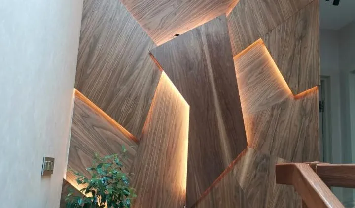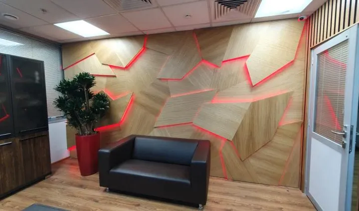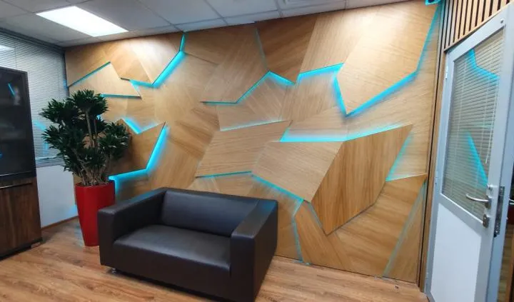 В дизайне входной группы использованы эффектные и объемные 3D-панели с декоративной светодиодной подсветкой, которая сделала композицию еще более оригинальной. Для подсветки панелей используется светодиодная лента с высоким индексом цветопередачи (CRI>98) и теплым белым свечением. Теплый цвет прекрасно гармонирует с деревянной текстурой панелей. В зоне ожидания подсветка реализована RGB-лентами, цвет свечения которых можно менять, экспериментируя и создавая особую атмосферу, актуальную для творческой студии.