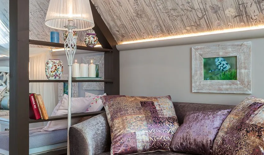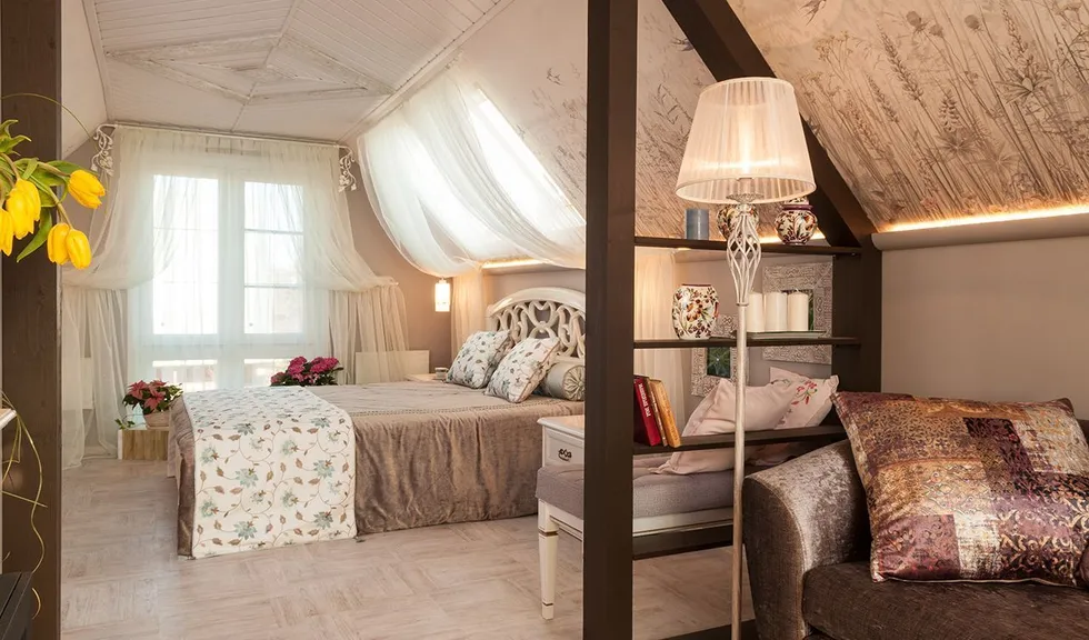 Интерьер спальни выполнен на пересечении двух стилей – классики и лофта. В спальне преобладают светлые тона и натуральные материалы, что создаёт атмосферу лёгкости и уюта. А дополнительный уют и «воздушность» придаёт светодиодная лента Arlight тёплого белого оттенка свечения.