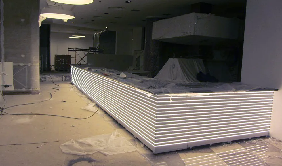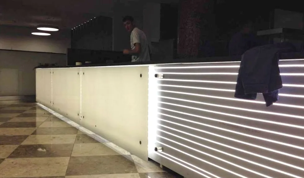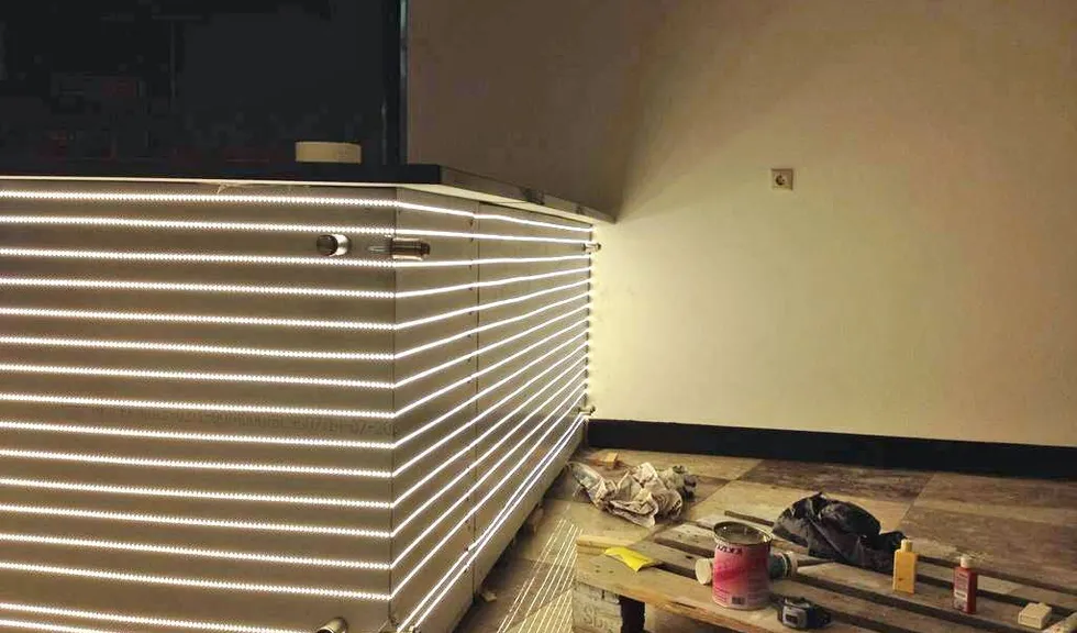 Для подсветки первой барной стойки использовалась светодиодная лента с тёплым белым свечением, для подсветки второй - с "чистым" белым. После монтажа светодиодных лент на барные стойки были установлены белые матовые стёкла.